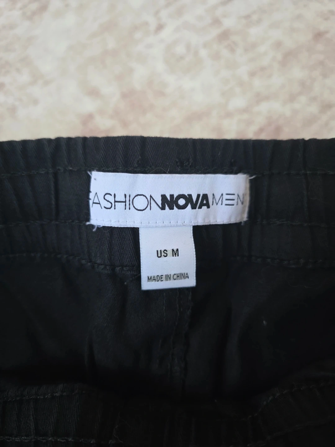 These Fashion Nova Men cargo pants are black with yellow accents. They're a size medium and feature a drawstring waist and zippered ankles. Multiple cargo pockets on the front and back.