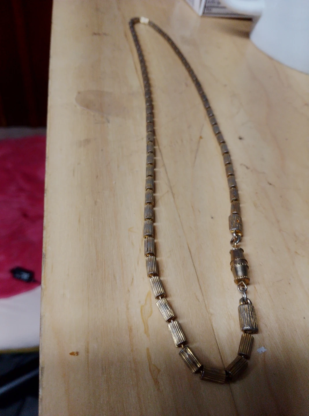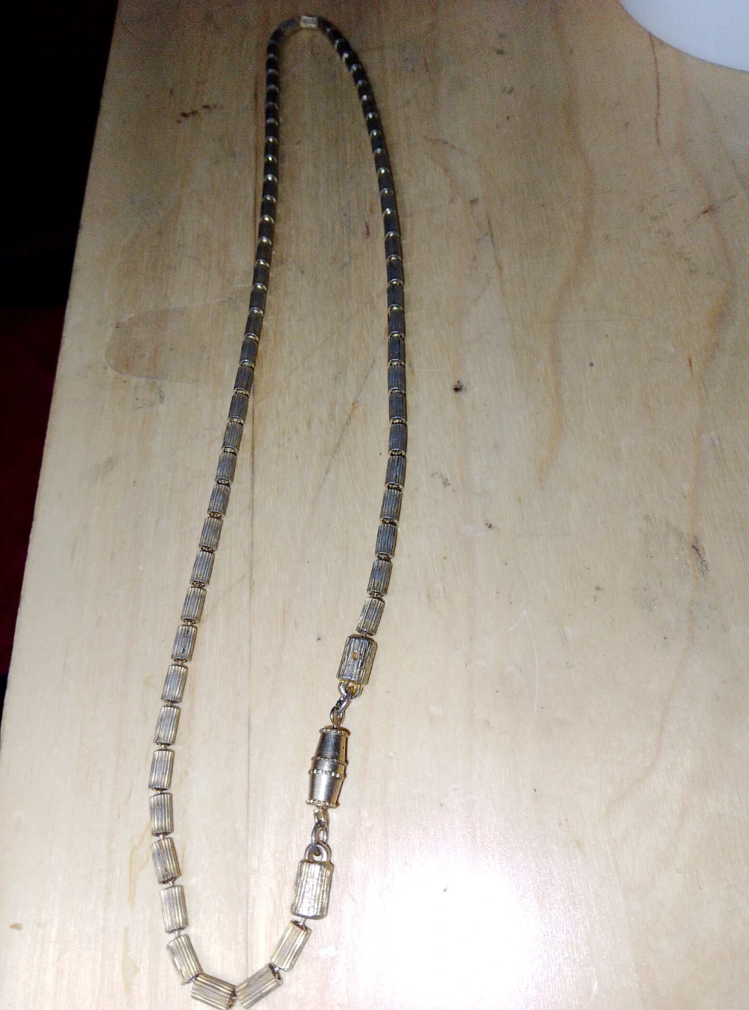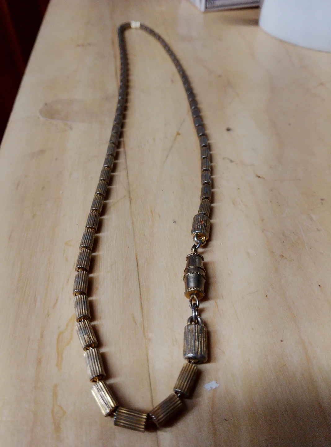 Selling a vintage necklace with a gold tone. It has a unique design with cylindrical beads and a secure clasp. The necklace is in good condition and ready to add a touch of retro style to your outfit!
