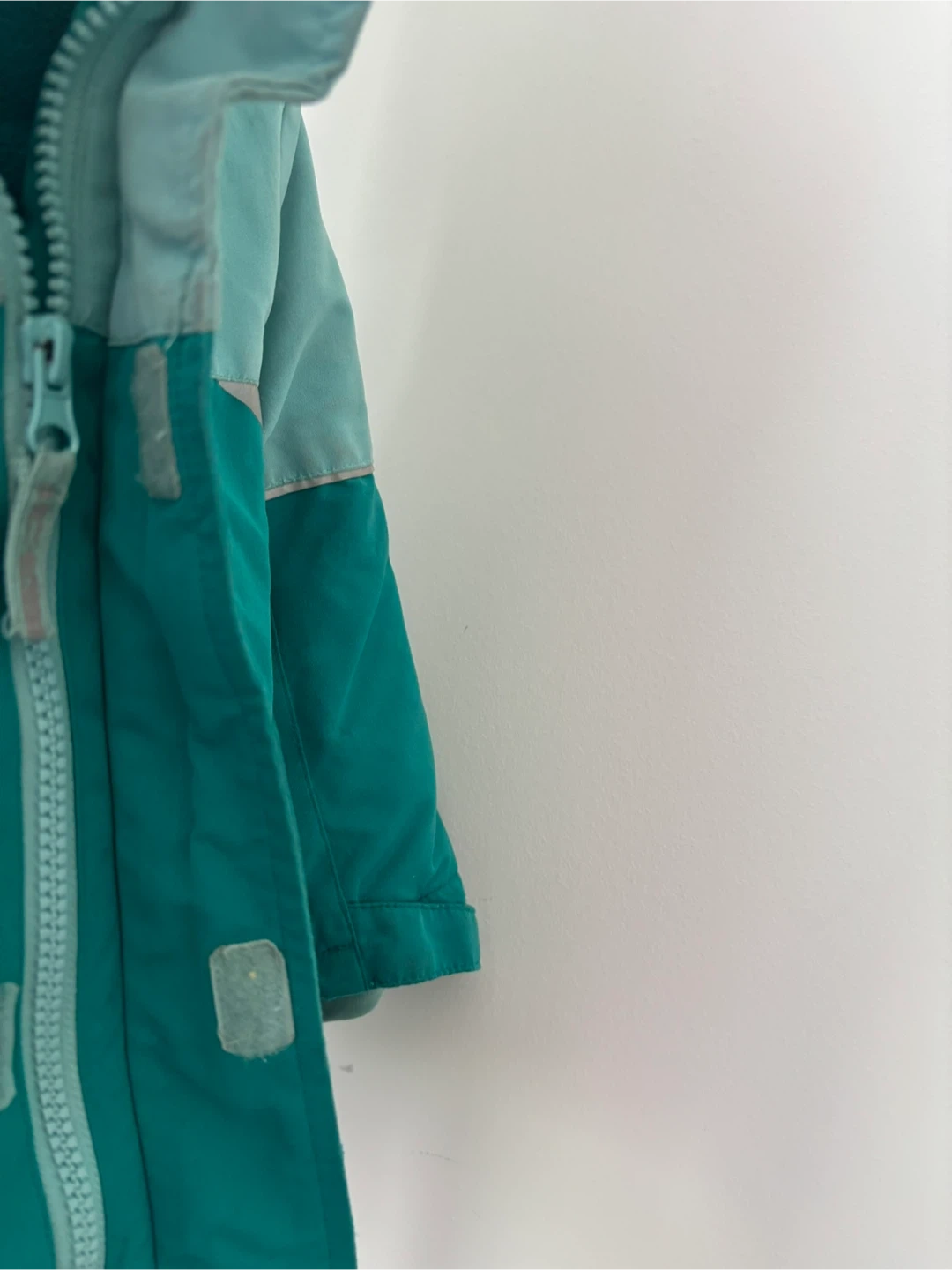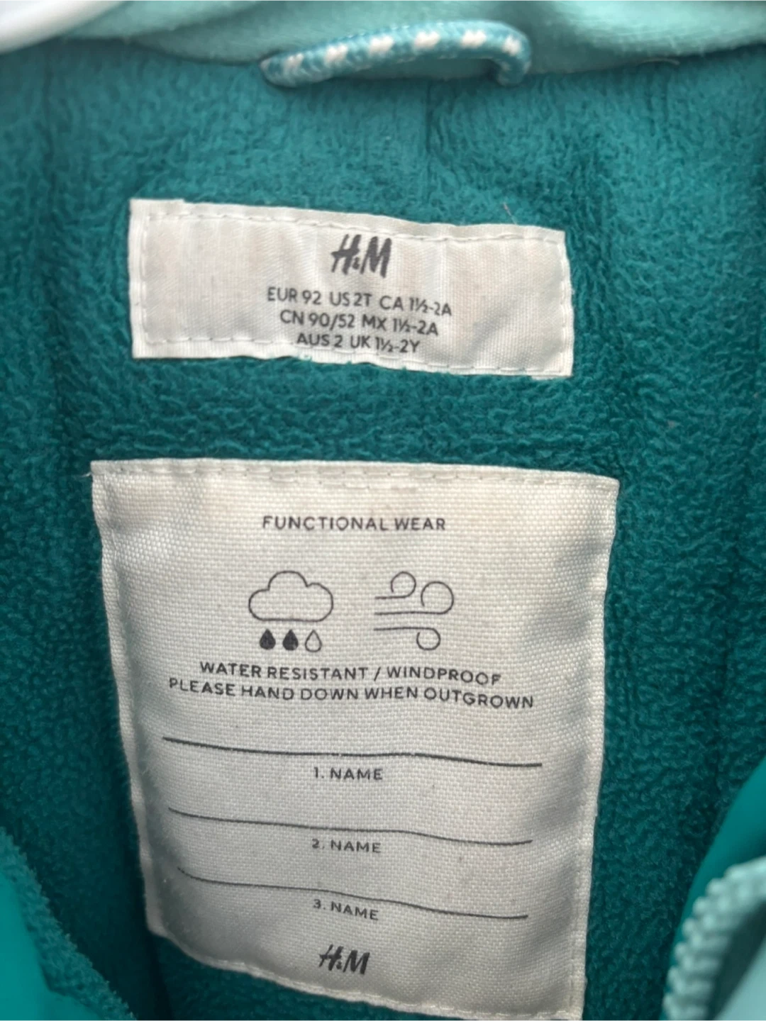 This H&M kids' jacket is designed for cold weather, offering water-resistant and windproof protection. It features a hooded design and zippered pockets. The size is EUR 92, US 2T.