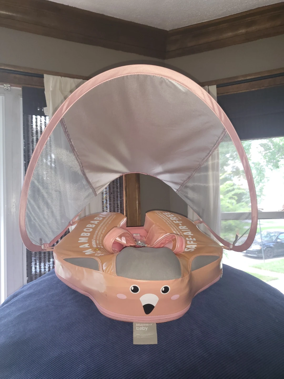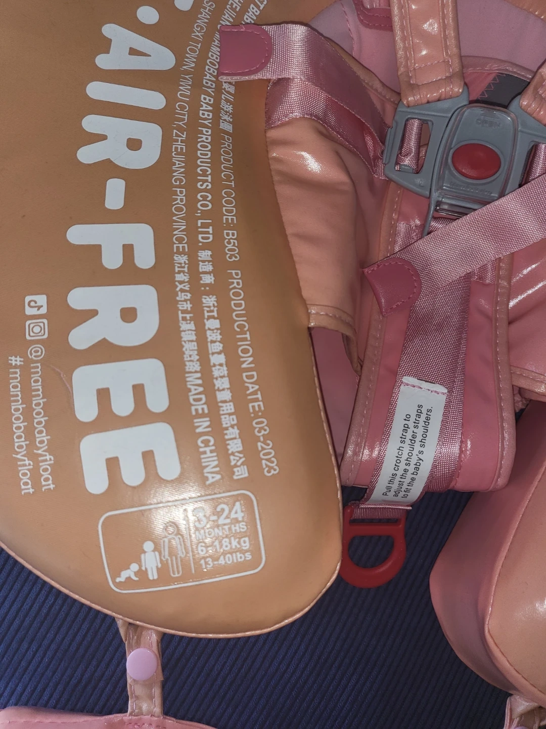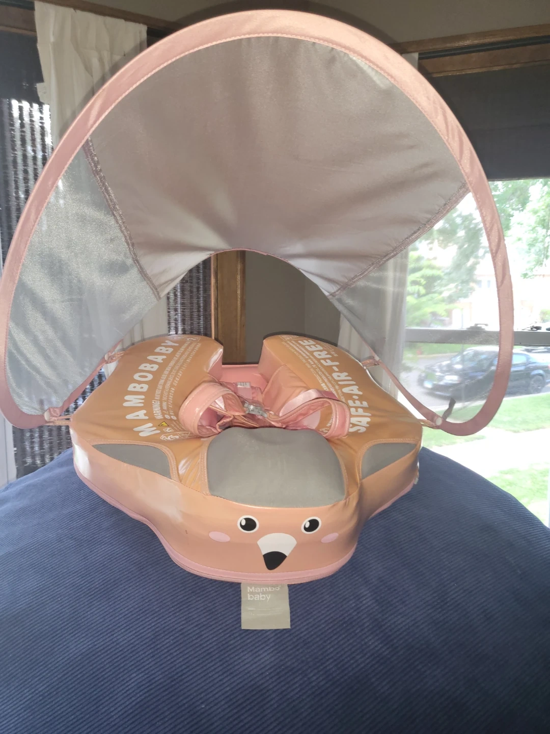 This MamboBaby swim float is designed for babies 6-24 months, supporting up to 13-40lbs. It's air-free and made in China. Features a detachable sun canopy for UV protection.