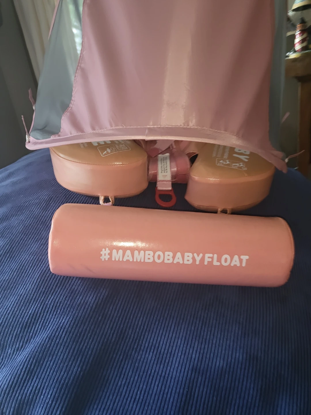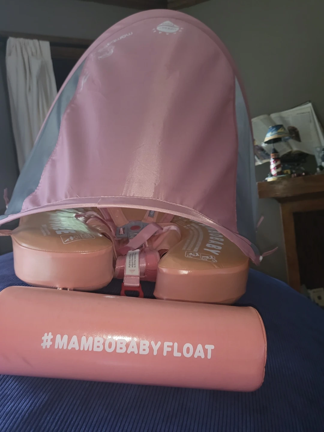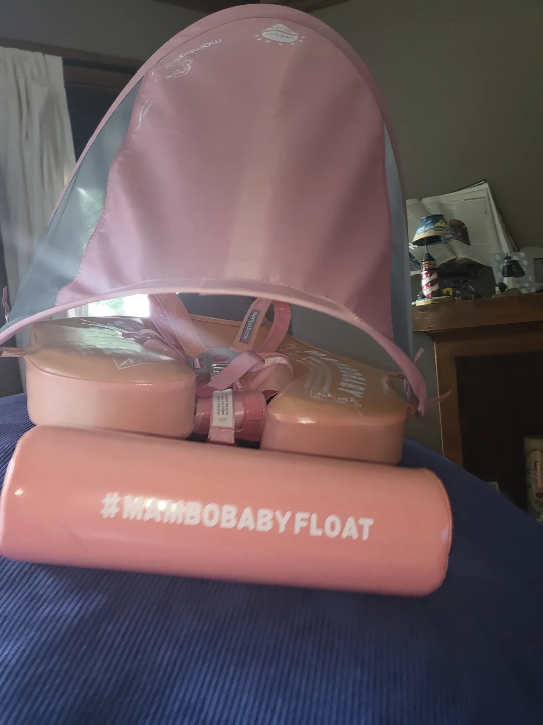 This MamboBaby swim float is designed for babies 6-24 months, supporting up to 13-40lbs. It's air-free and made in China. Features a detachable sun canopy for UV protection.