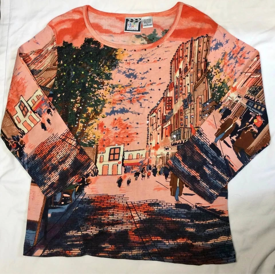 New, missing tag. This Y2K Take Two Clothing Co Women's L shirt is a vibrant and colorful piece featuring an all-over print of city streets. It's made of 100% cotton with 3/4 sleeves, a round neckline, and a pullover closure, perfect for casual occasions. The shirt has beaded and sequin accents for a touch of sparkle. It has a regular fit and breathable material, making it stylish and comfortable. If it’s listed, it’s available! Cash only, public meetup in Manhattan / Hell's Kitchen.