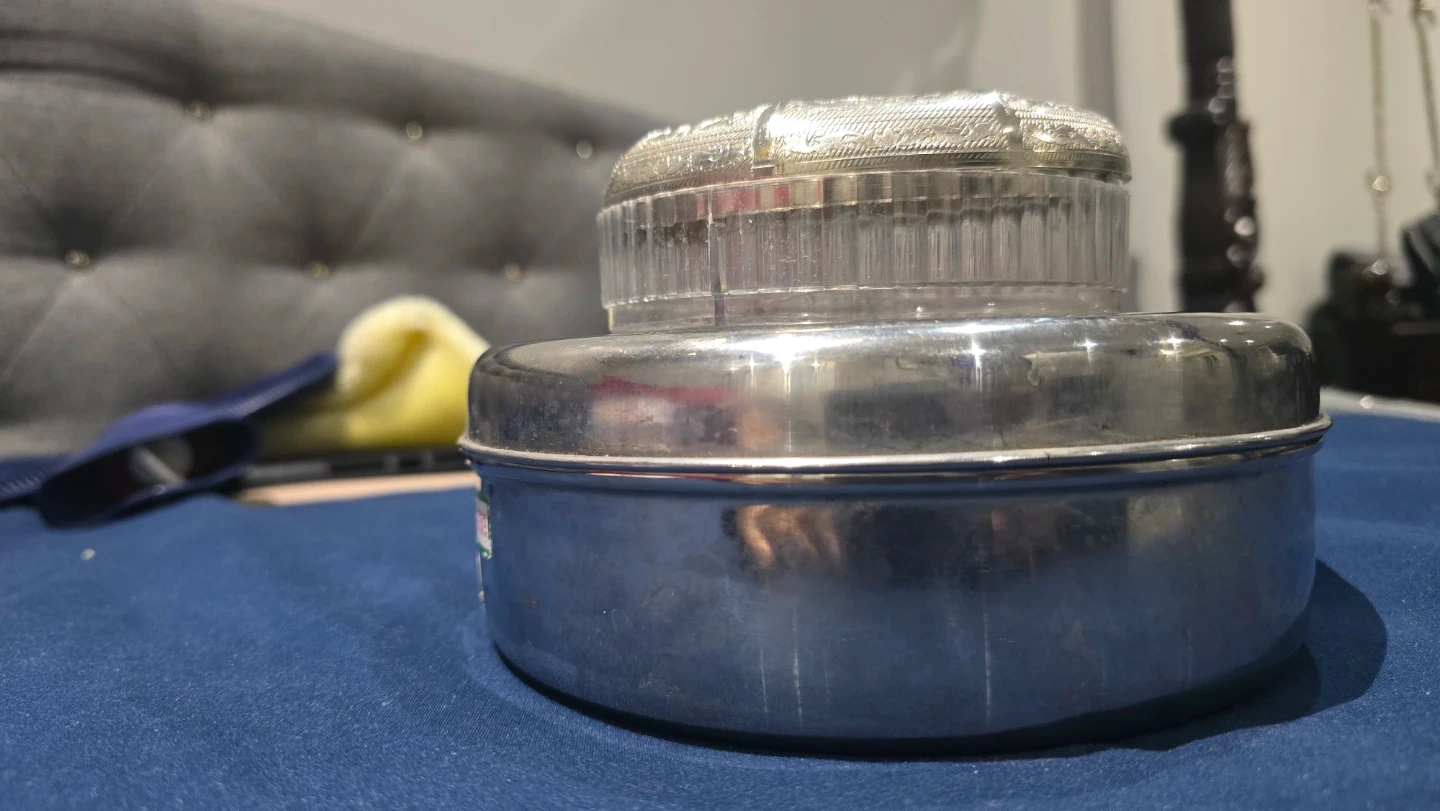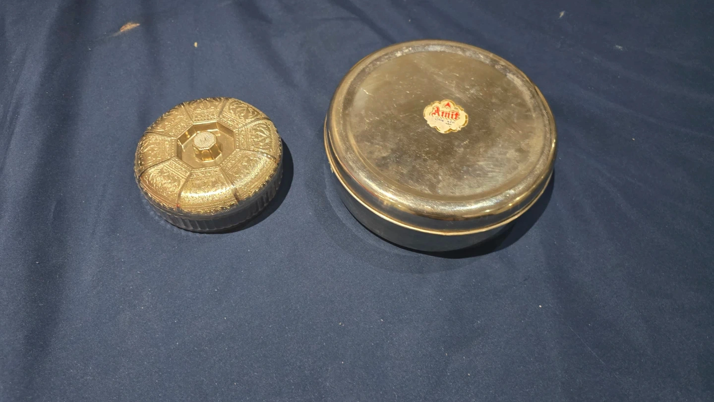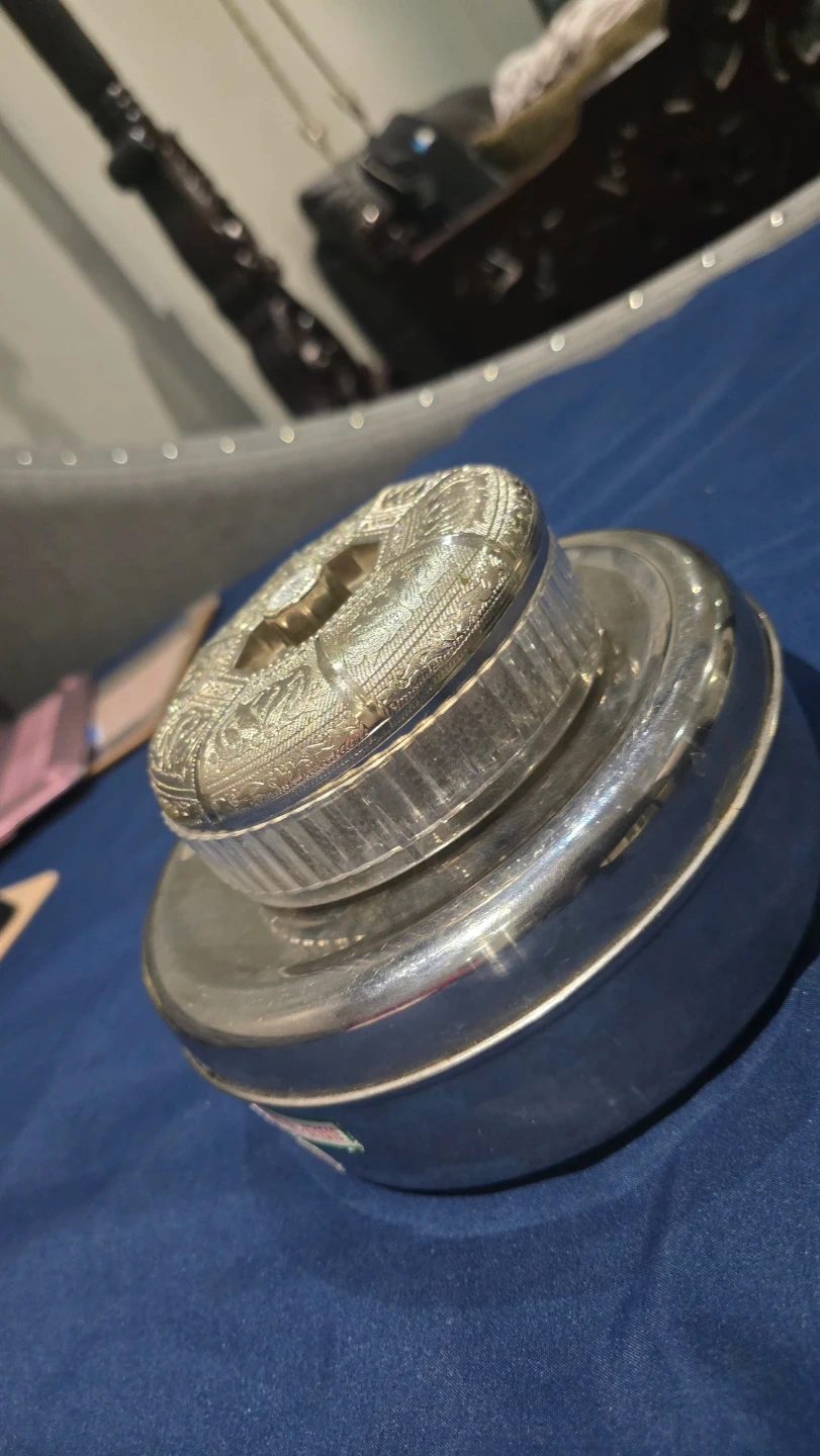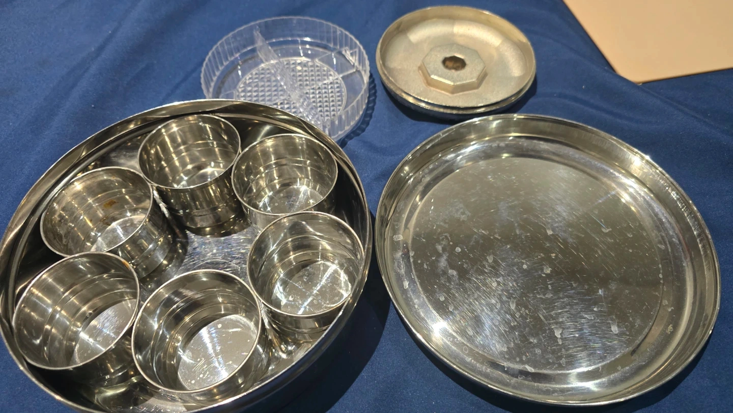 This stainless steel spice box set includes a large container with individual cups for spices. It also comes with a decorative etched lid. Perfect for organizing and serving your favourite spices!