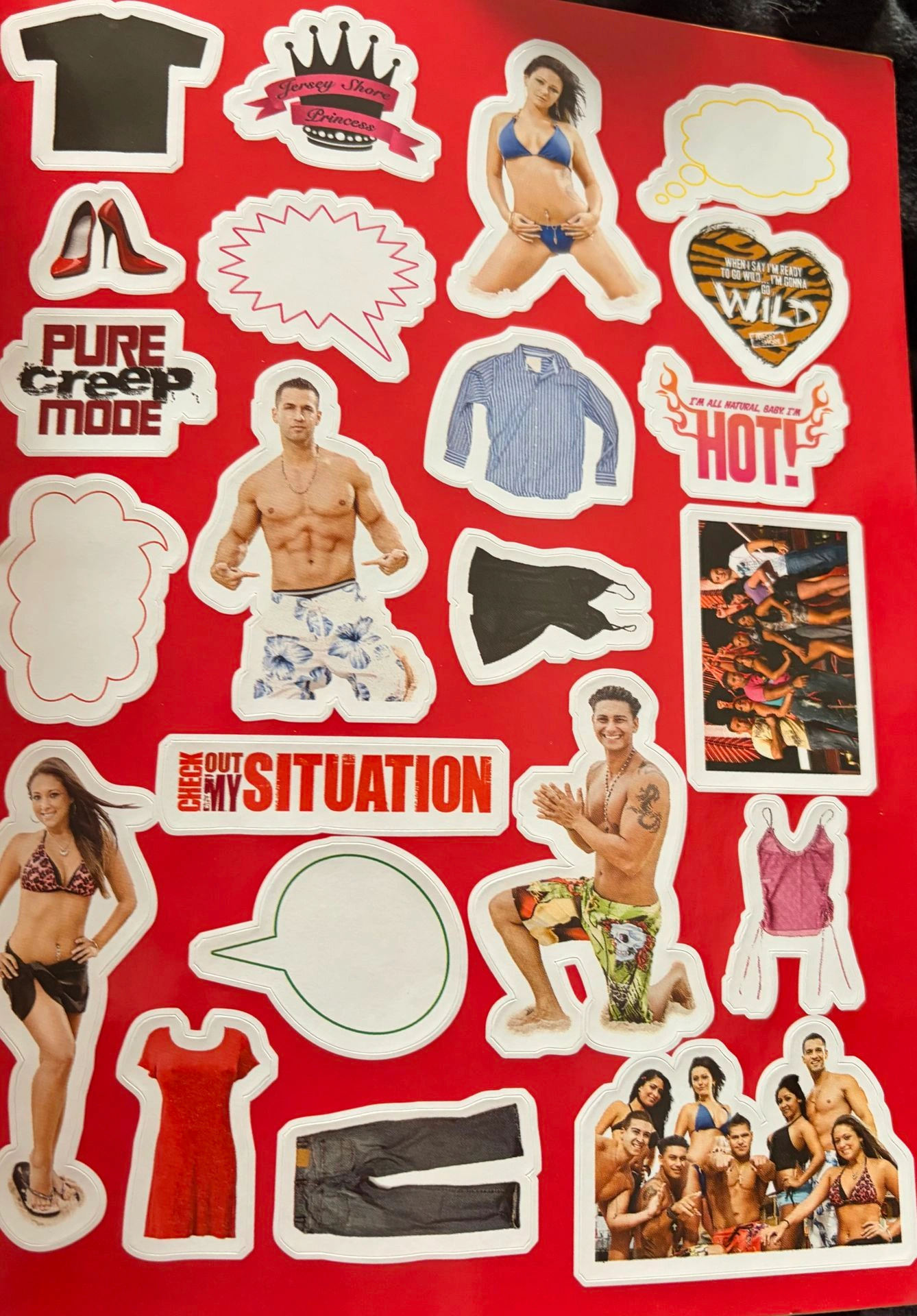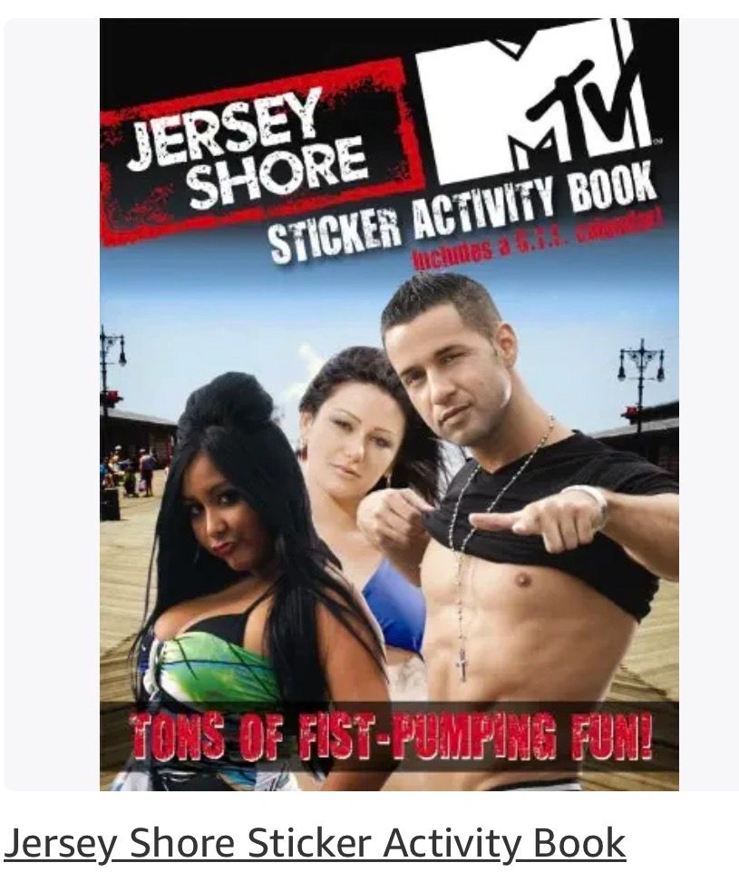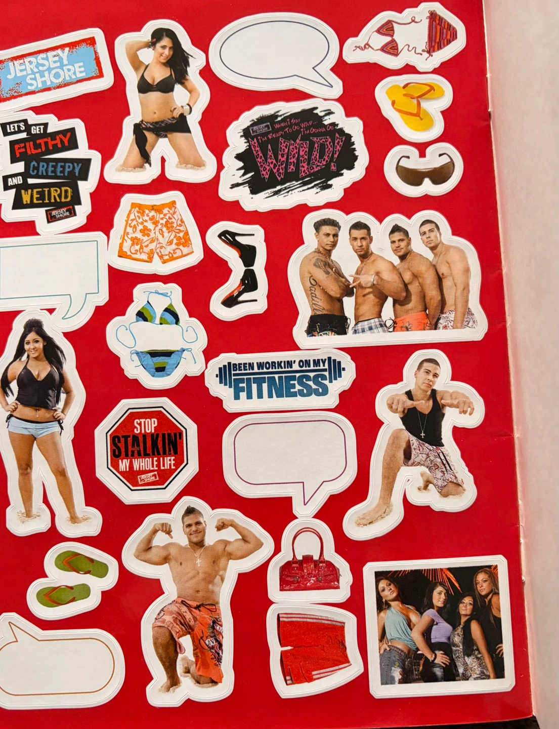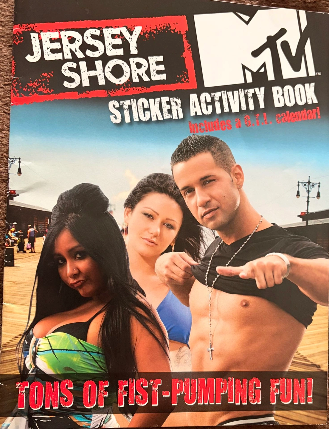 Brand new, never used MTV Jersey Shore Sticker Activity Book. Perfect for fans or collectors! Includes all stickers intact and the G.T.L. calendar centerfold. This is a full-color sticker activity book based on the popular MTV reality show Jersey Shore, featuring cast members like Nicole "Snooki" Polizzi, Jenni "JWOWW" Farley, and Mike "The Situation" Sorrentino. Includes what the cover describes as "tons of fist-pumping fun!" and a G.T.L. calendar.