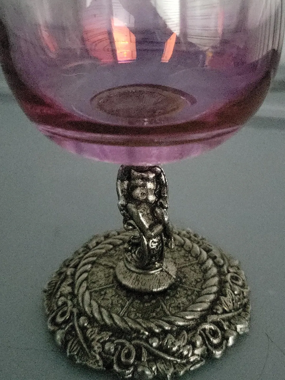 A beautiful pink glass dish with an ornate silver-tone base featuring a cherub. Perfect for holding small trinkets or as a decorative piece. Measures approximately 6 inches tall.