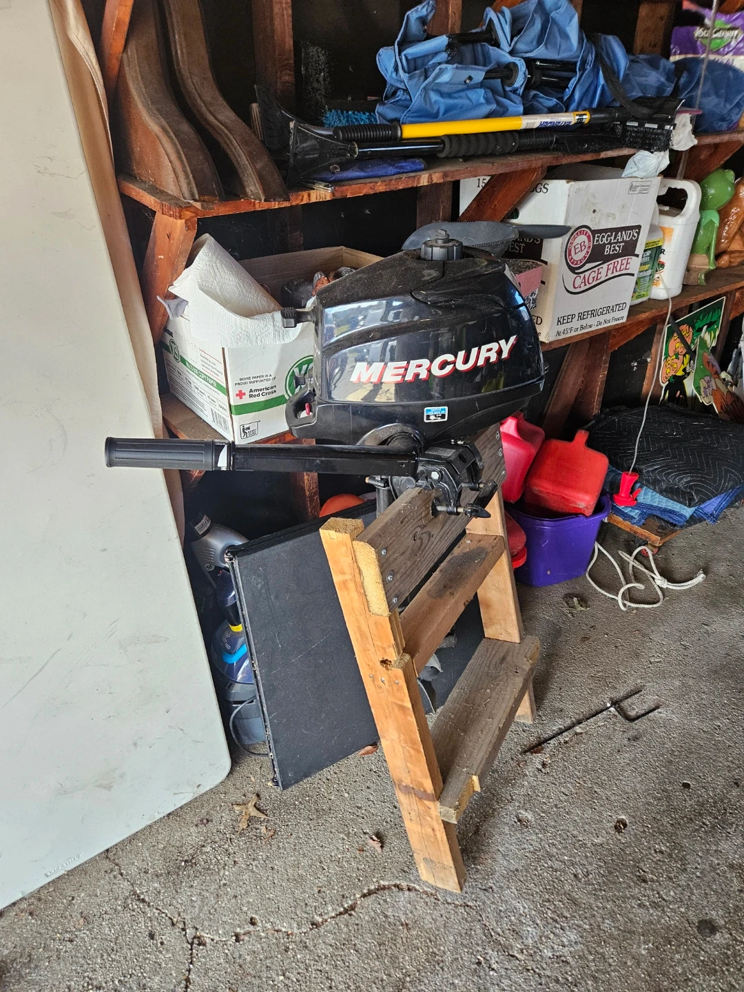 Mercury 3.5 HP outboard motor. This motor's serial number is 0R743753. It's black in color and looks to be in good condition.