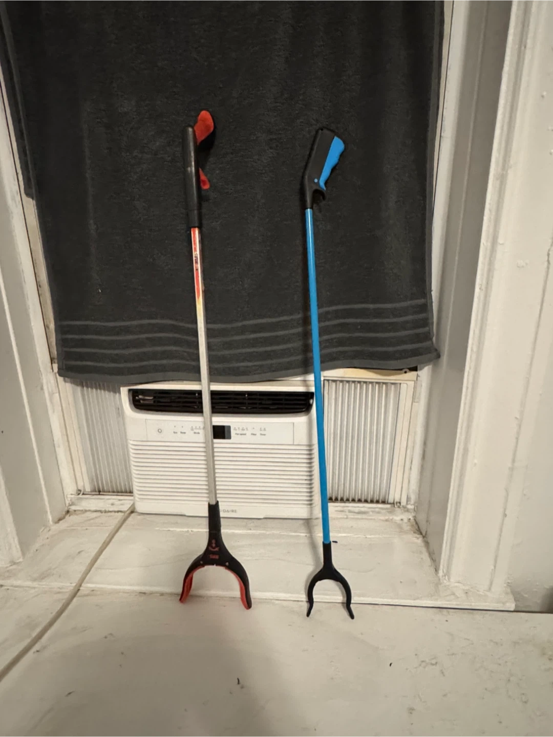 Includes one red-handled grabber and one blue-handled grabber. These tools are great for picking up trash or reaching items. Lightweight design for easy use. PICK UP ASAP - IN THE BRONX.
