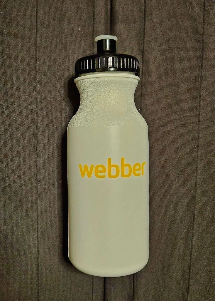 White water bottle with black lid. The brand name 'Webber' is printed in yellow on the bottle.