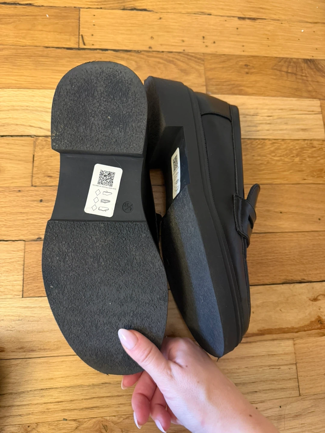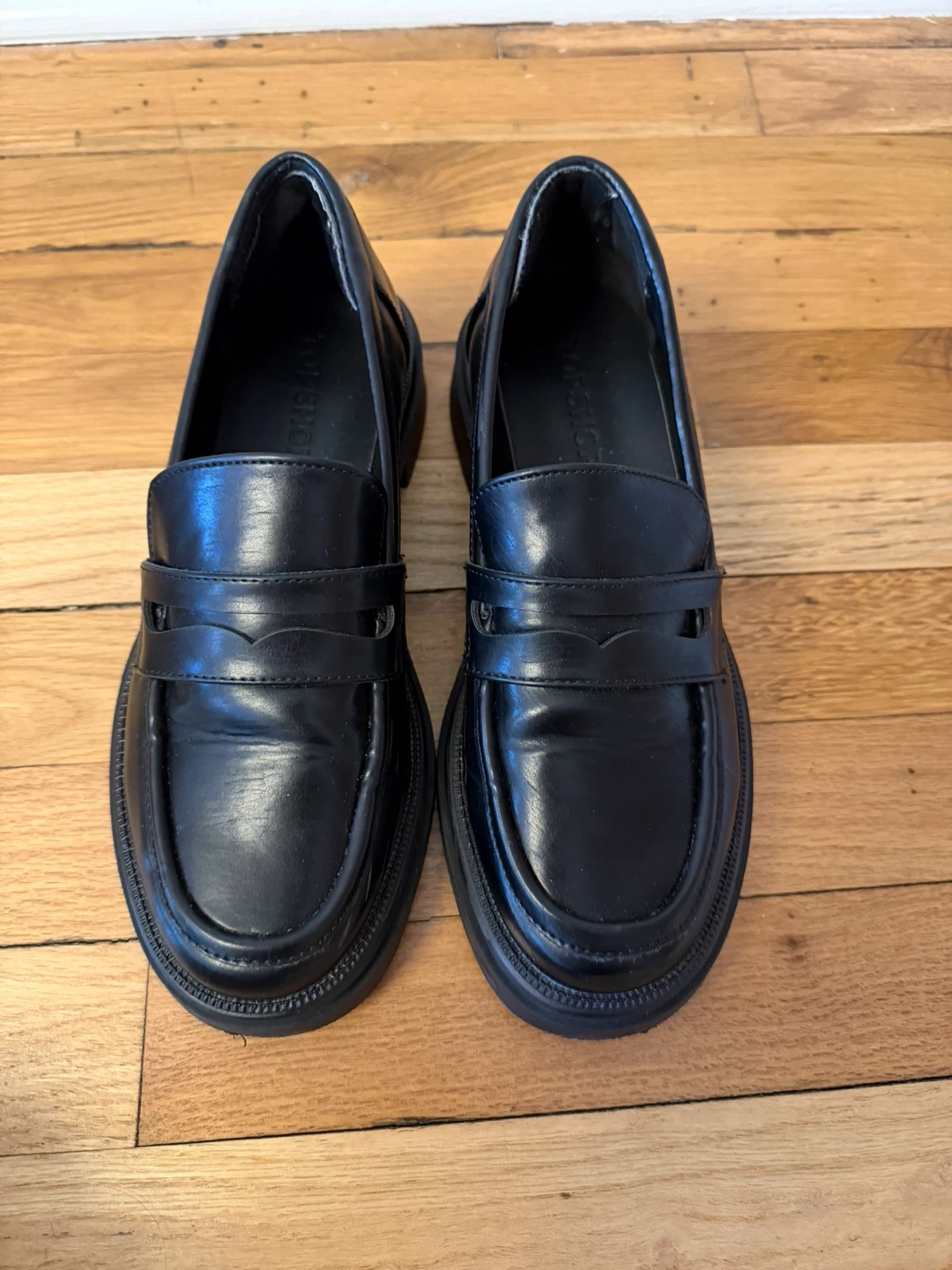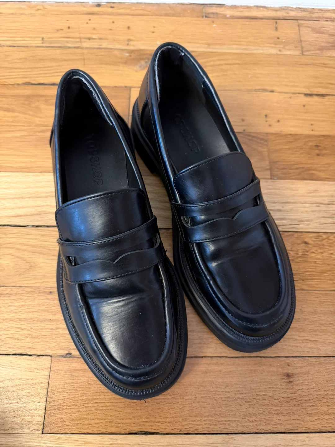 Stylish black chunky loafers from TOPSHOP. These feature a classic penny loafer design with a modern platform sole. Genuine leather construction for durability. Perfect for adding a bit of edge to any outfit!