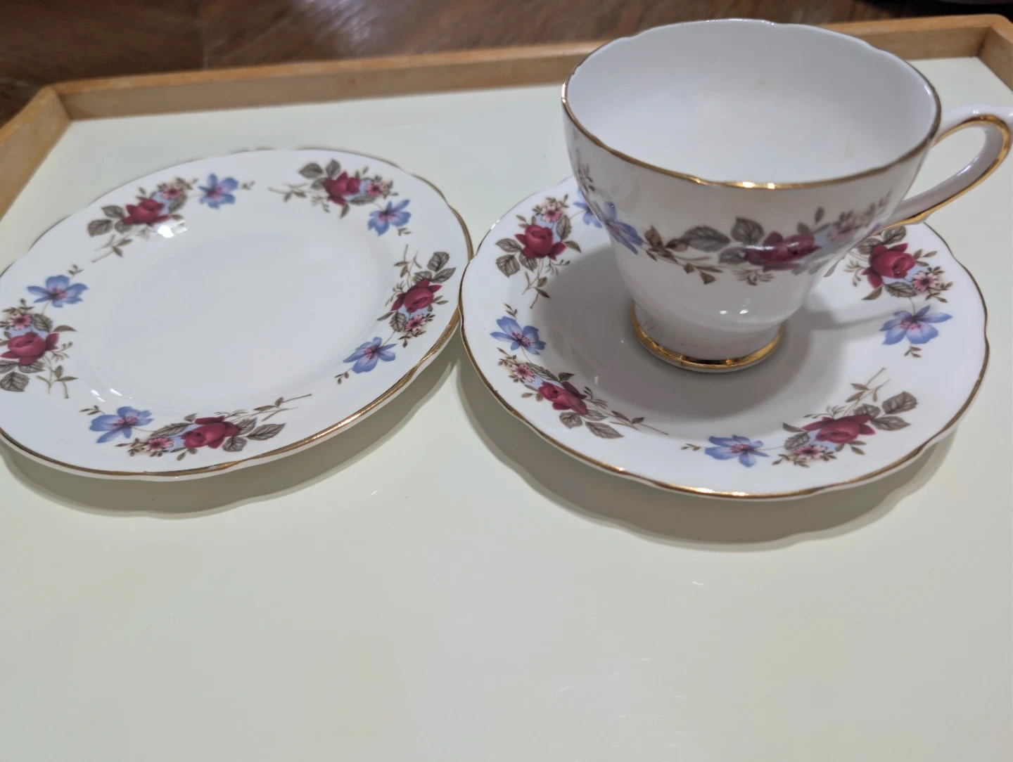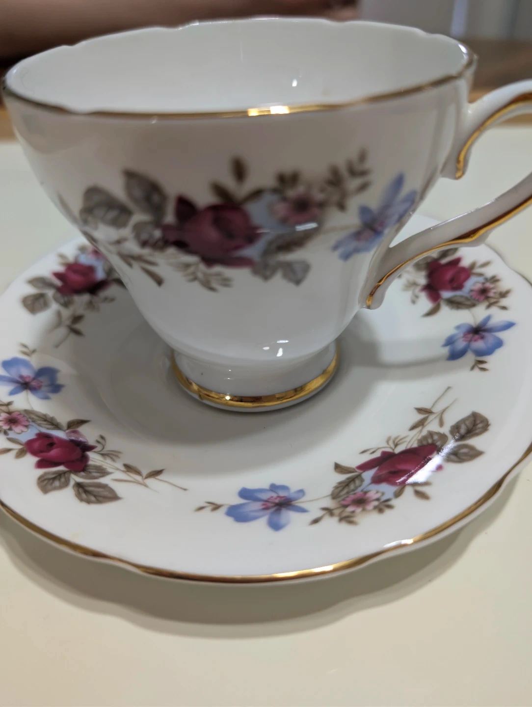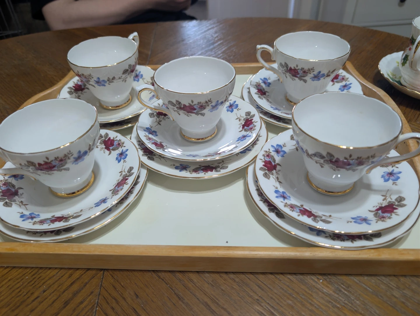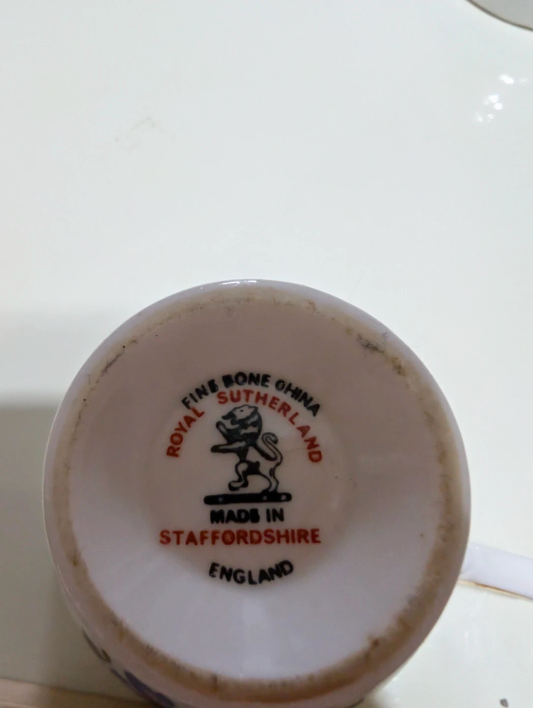 A set of Royal Sutherland fine bone china cups and saucers with a floral design. Made in Staffordshire, England. This classic set would be lovely for afternoon tea!