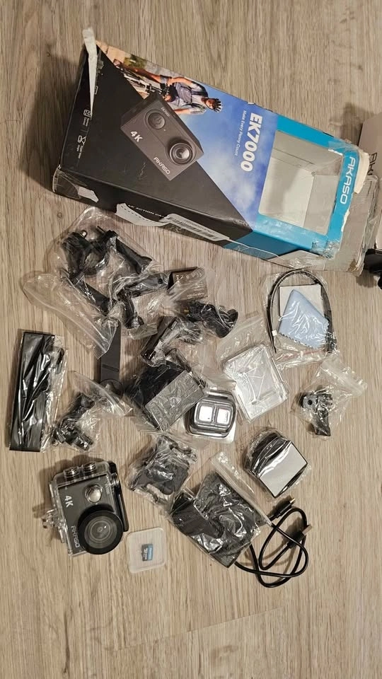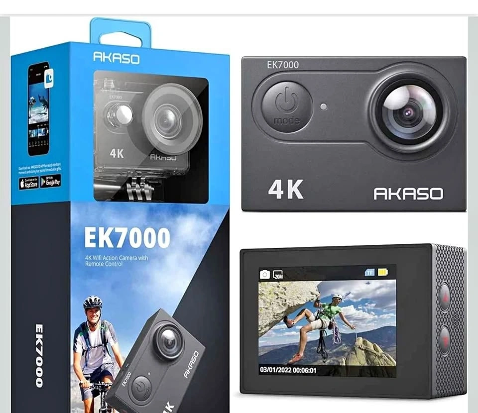 AKASO EK7000 4K30FPS 20MP WiFi Action Camera with EIS Ultra HD 131FT Waterproof Underwater Camera. Includes Remote Control, 4X Zoom, and Support for External Microphone. Comes in Black with a 64GB microSDXC U3 Memory Card. Feel free to message if you have any questions!