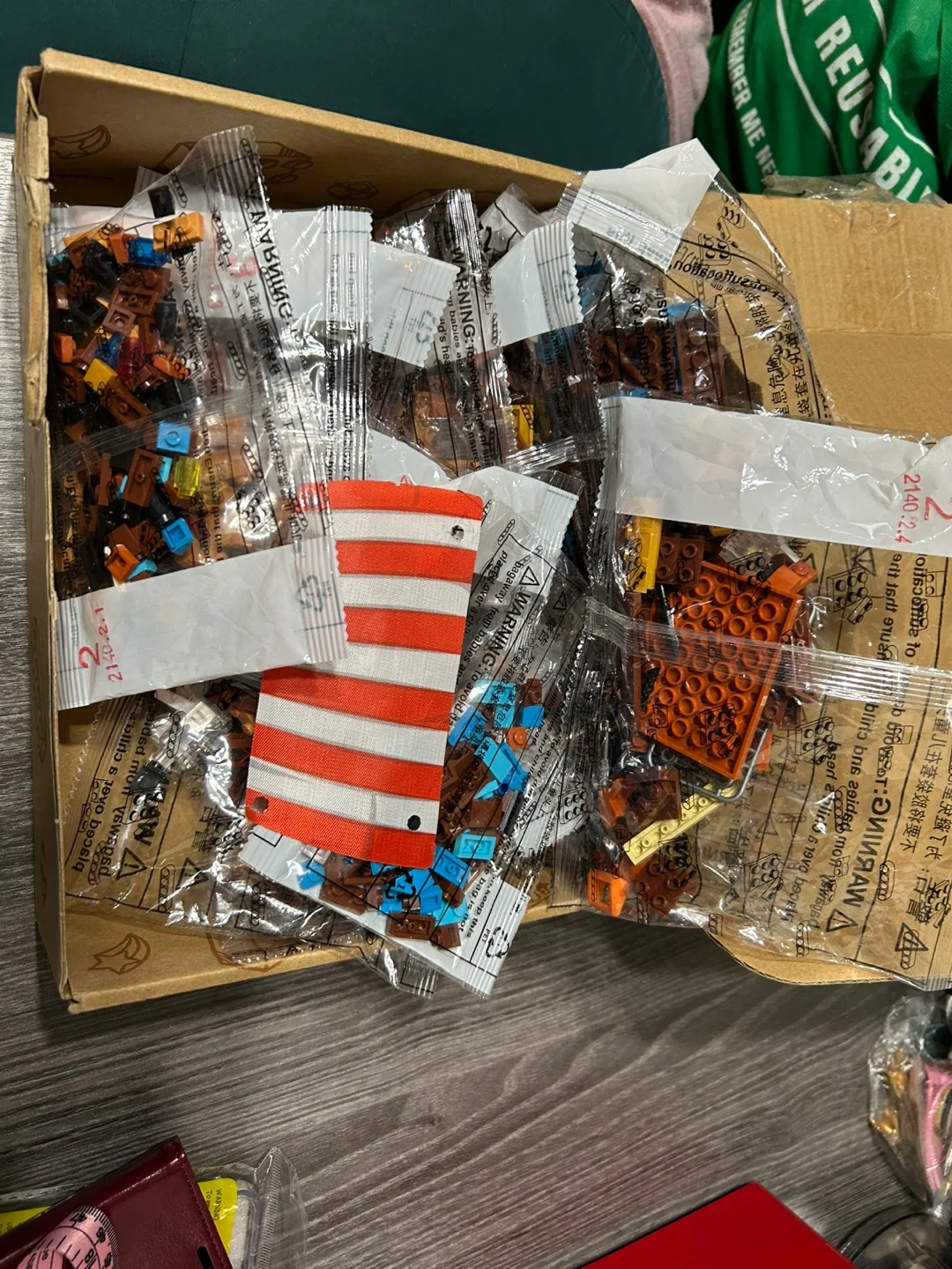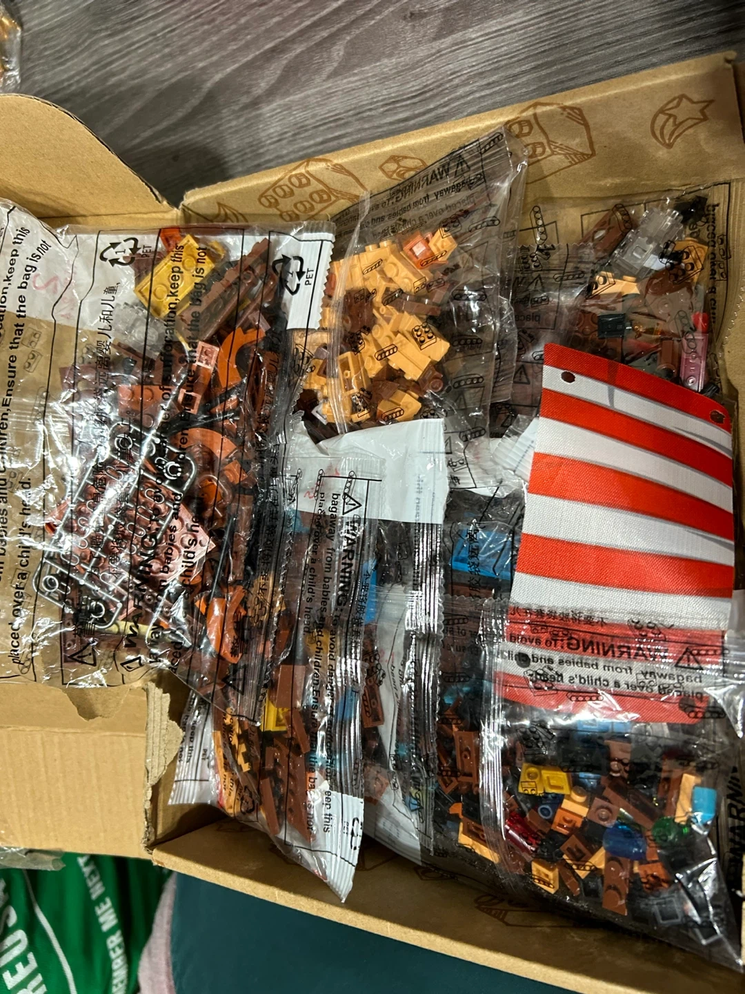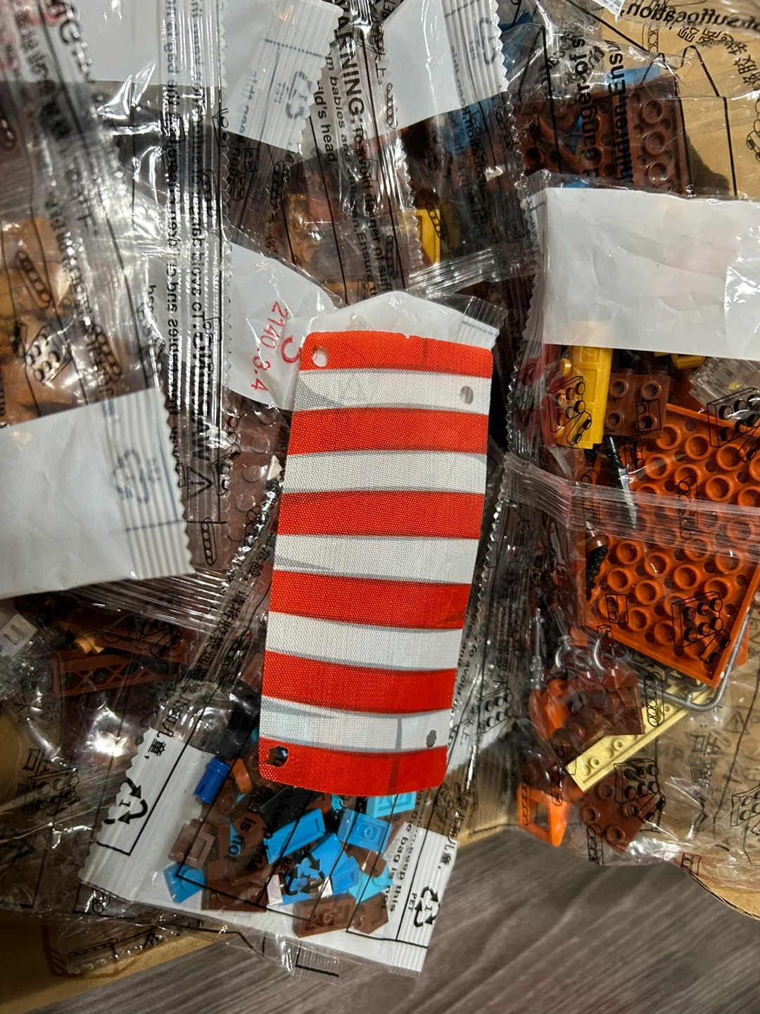 This new building block set comes with multiple bags of bricks in brown and orange tones. It includes a red and white striped flag piece. Perfect for creative building projects!