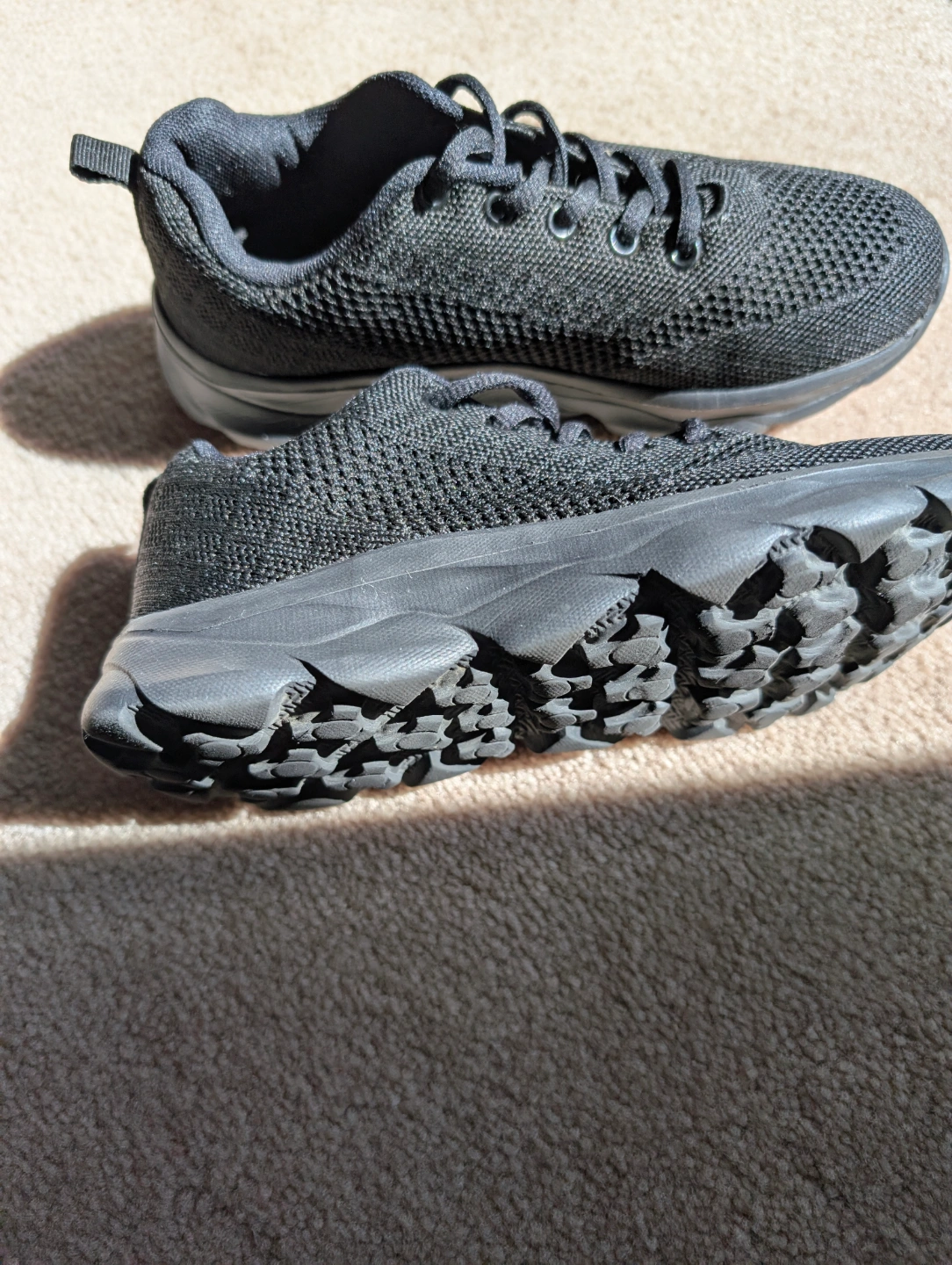 Pair of black running shoes. Knit upper. Chunky sole. Lace-up closure.