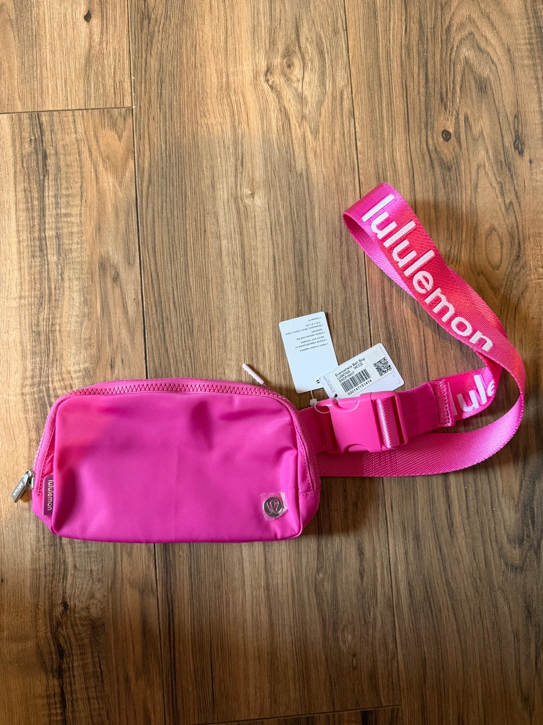 This is a Lululemon Everywhere Belt Bag. Cool toned bright Barbie pink color with white lettering logo on strap.