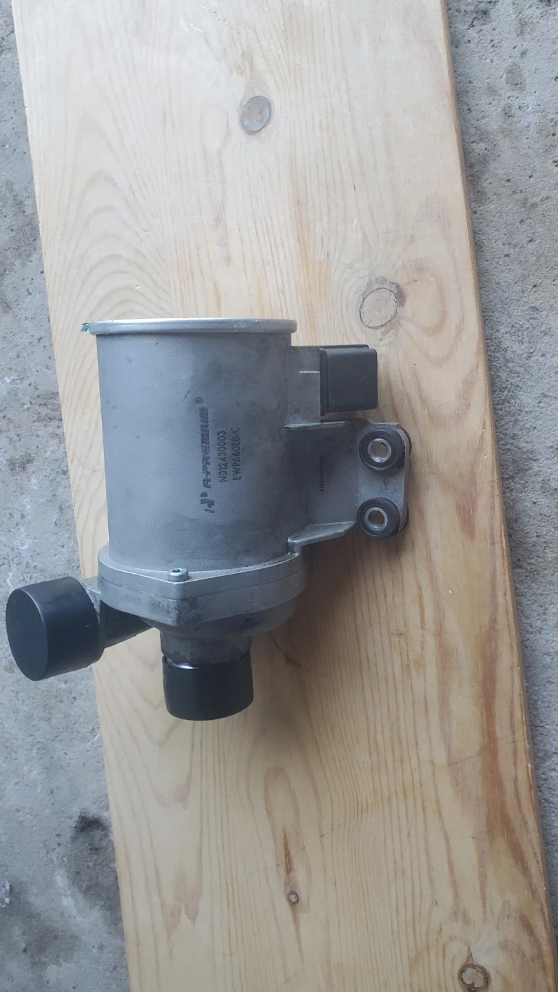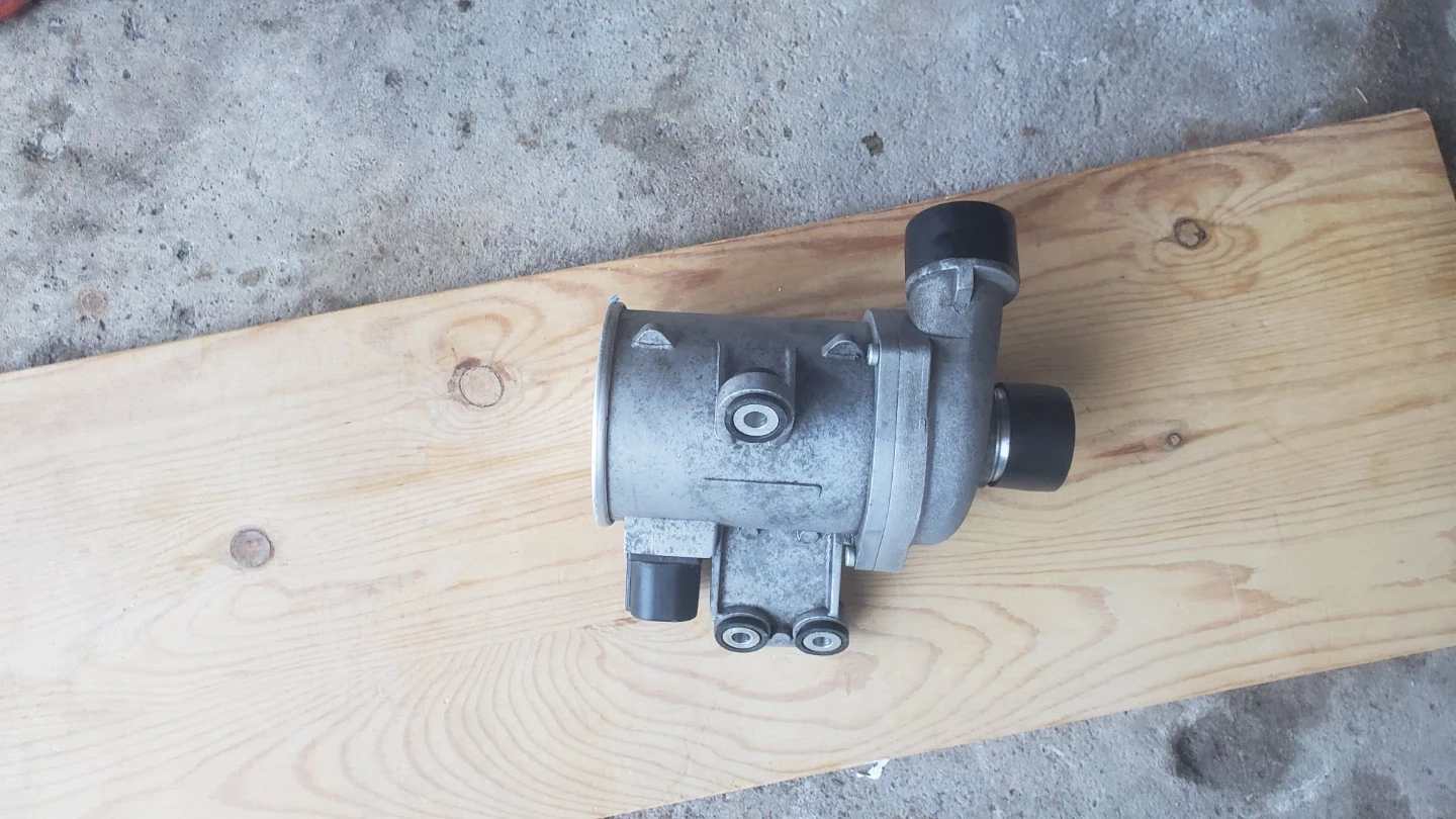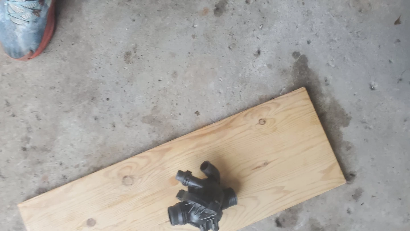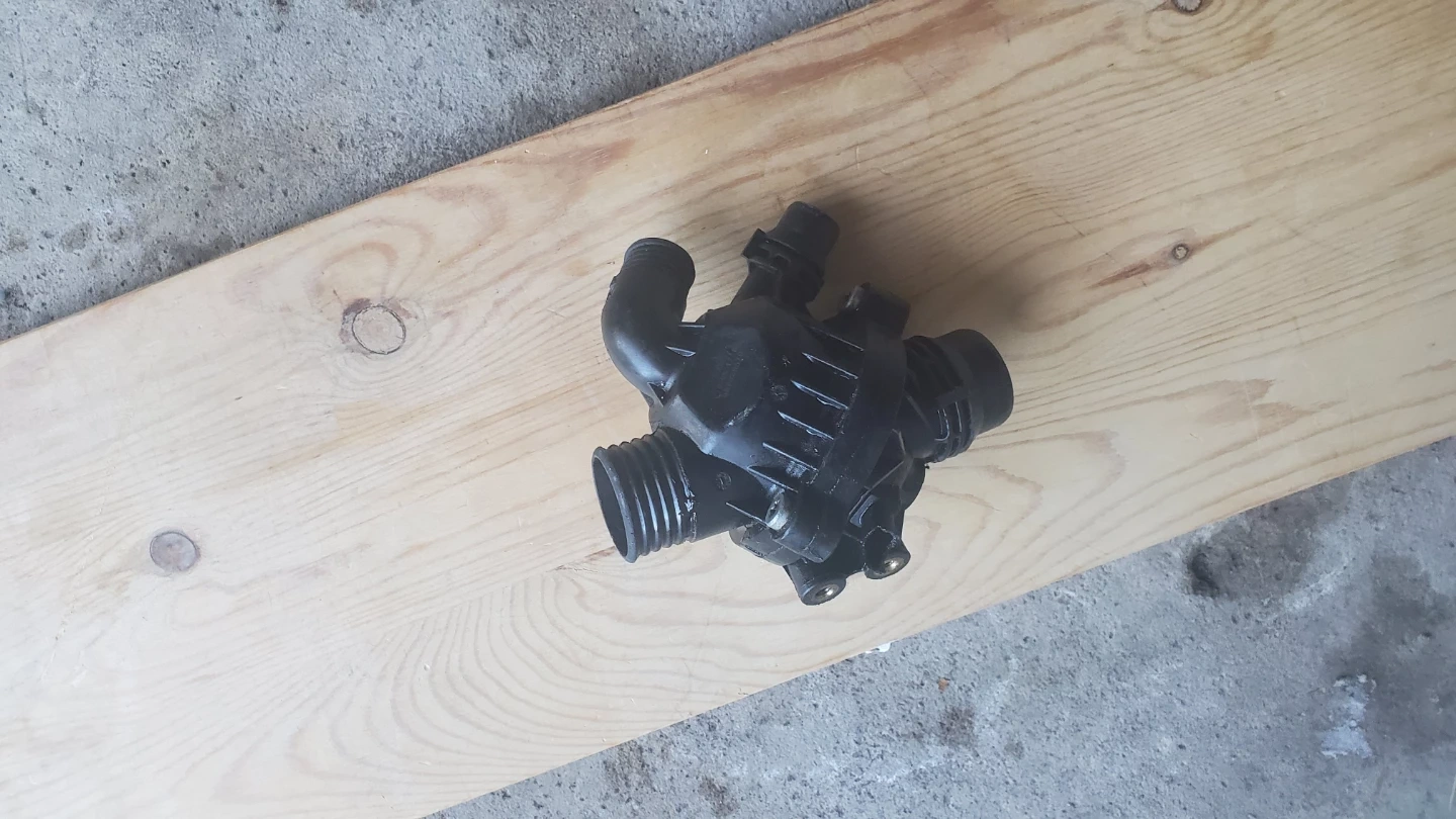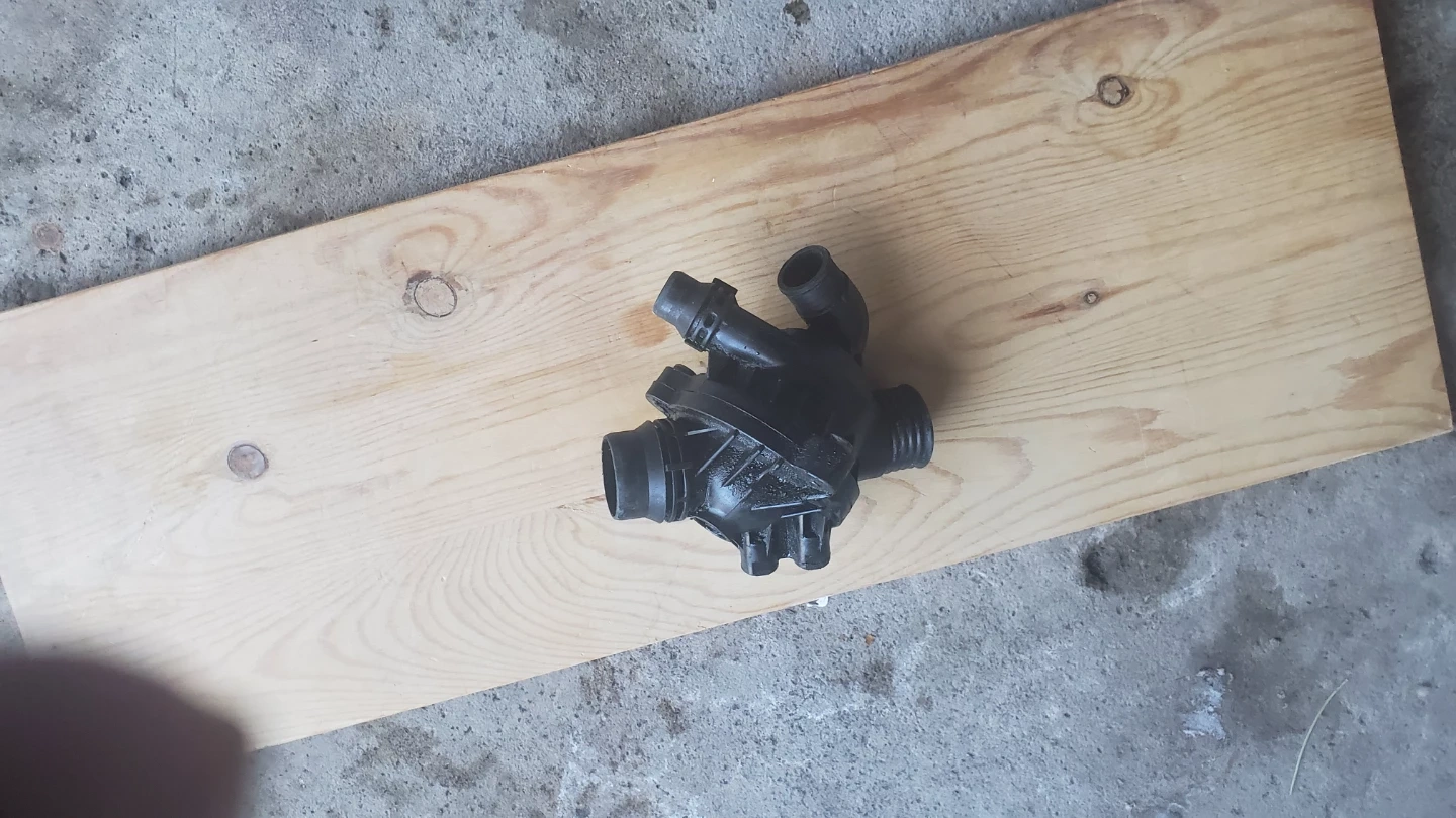 This is a water pump assembly. It's a black plastic component with multiple hose connections and a threaded fitting. This part is designed for automotive cooling systems. And the thermostat is in very good condition both for bmw x5 2013