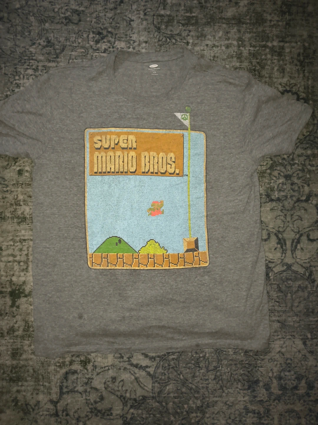 Grey heather t-shirt with a classic Super Mario Bros. graphic print. 100% cotton fabric. Size L. Machine washable.