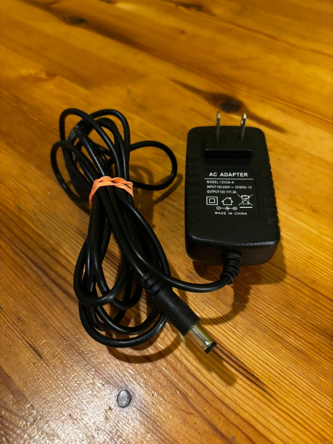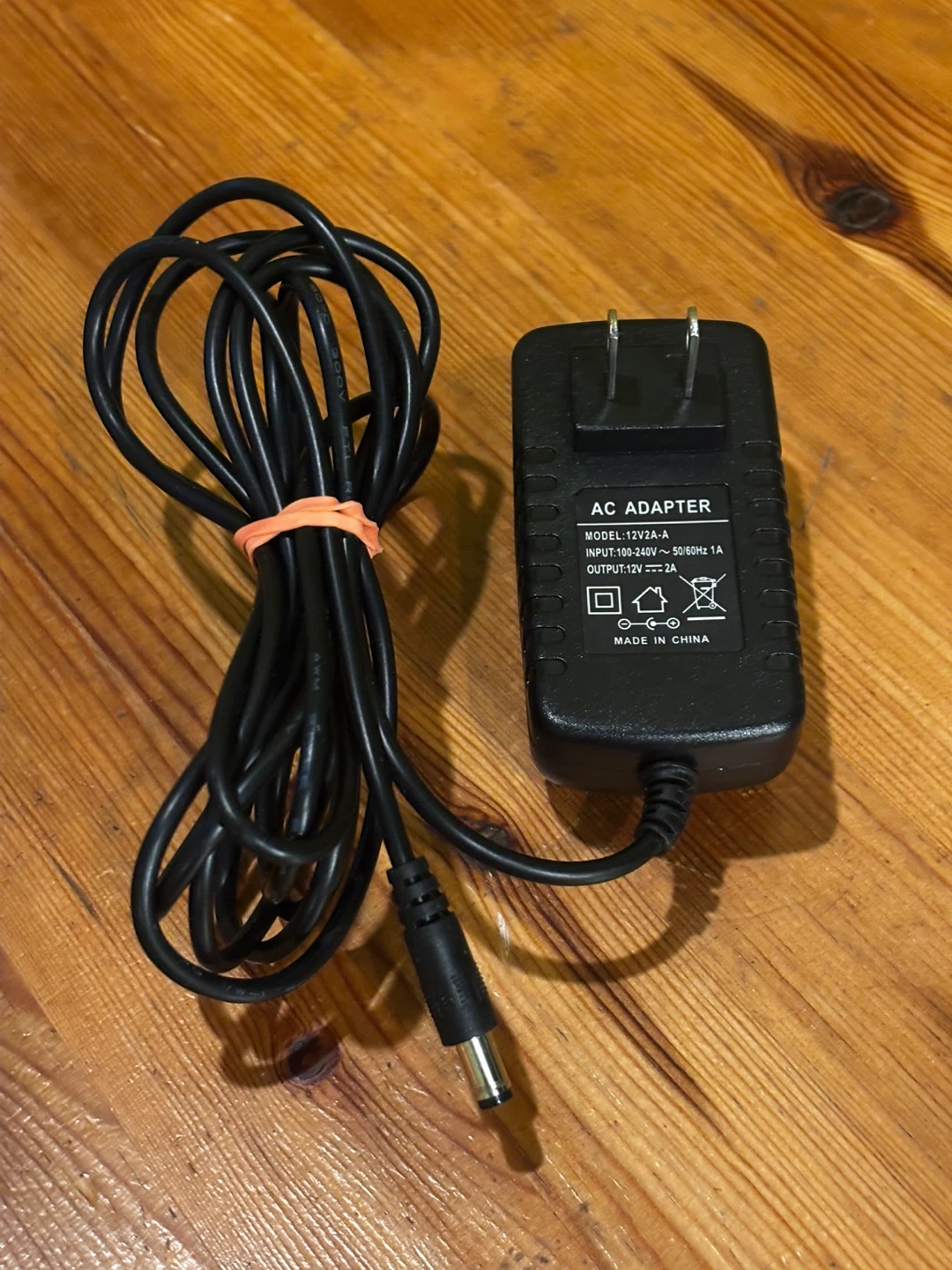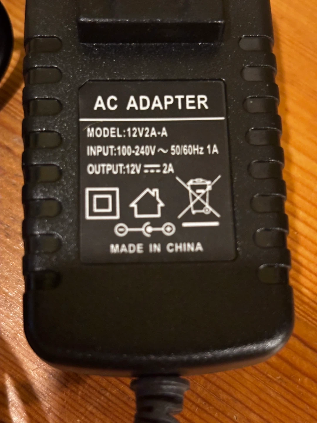 AC adapter with model number 12V2A-A. Input is 100-240V 50/60Hz 1A. Output is 12V 2A. Made in China. This adapter is compatible with devices requiring a 12V 2A power supply.