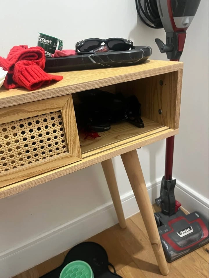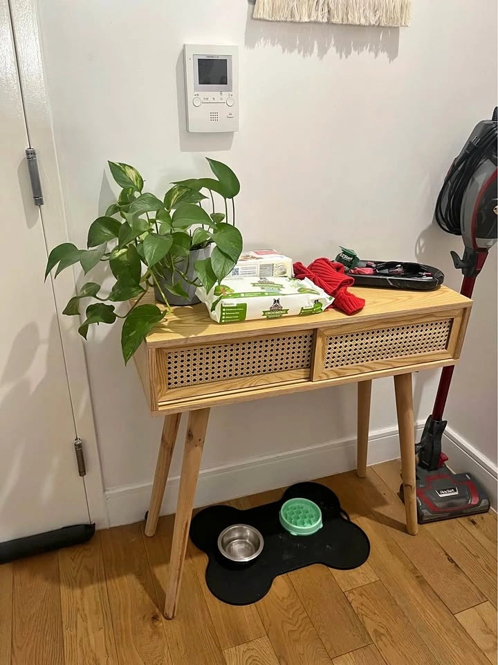 Entryway stand with storage inside. Stuff on top and inside not included. Can be a little wobbly when opening drawers, but good with a big plant on top like shown to help keep stable. Length- 31 1/2, Width- 12 inches, Height-31 1/2. Door pickup only - 2nd floor walk up - can help you get it out!