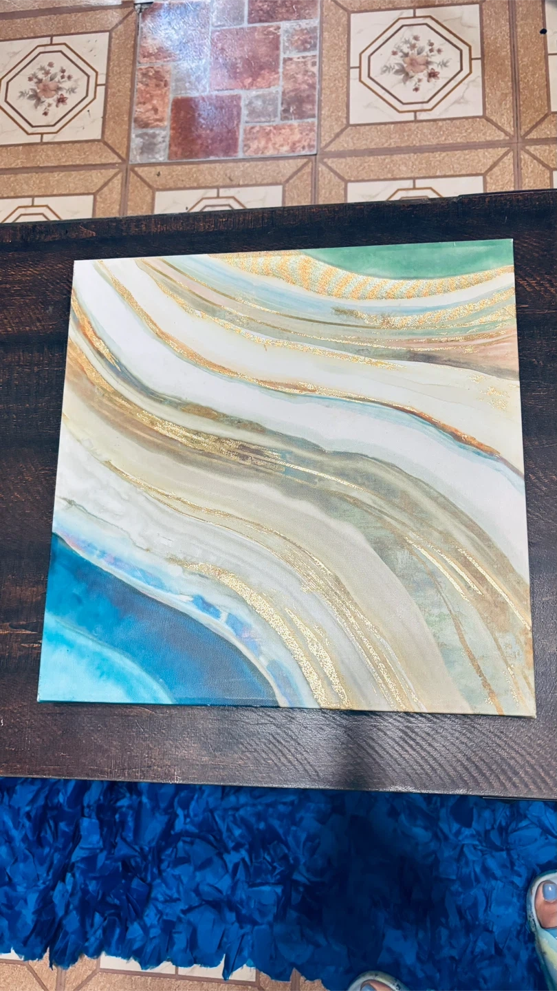 This abstract canvas wall art features flowing waves of blues, greens, and gold metallic accents. It's ready to hang and adds a modern touch to any room. The dimensions are approximately 12x12 inches, making it a versatile piece for various spaces.