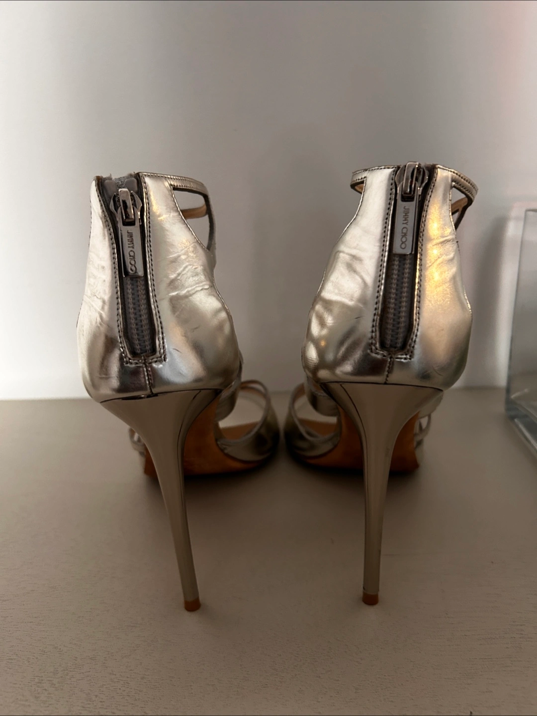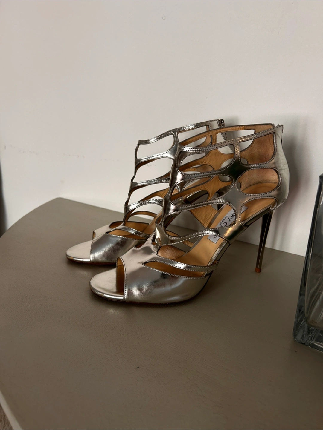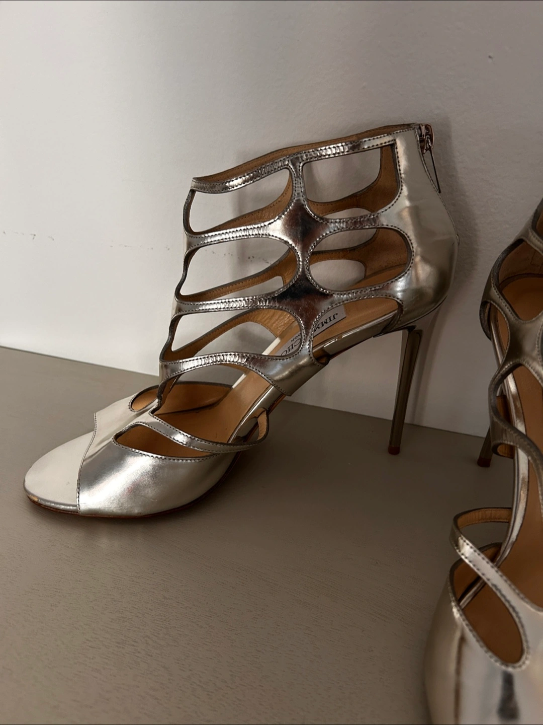 Selling a pair of Jimmy Choo heels in silver. They are in good condition and ready for a night out!