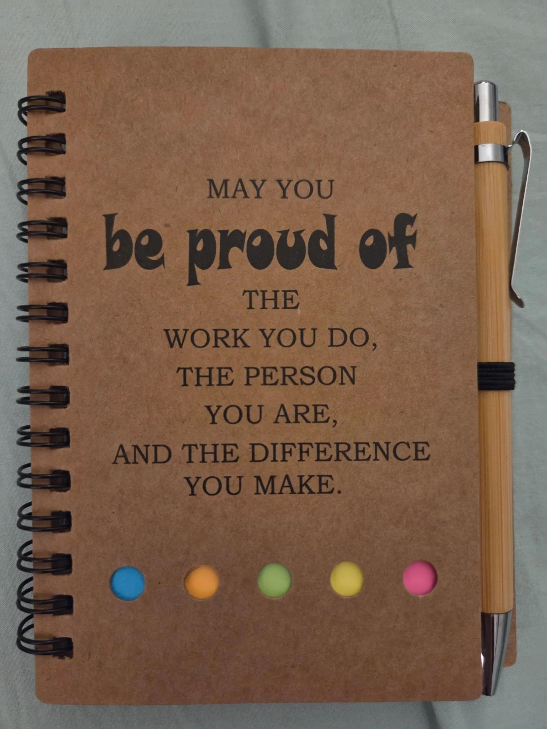 Spiral-bound notebook with a Kraft cover. Features a motivational quote: 'MAY YOU be proud of THE WORK YOU DO, THE PERSON YOU ARE, AND THE DIFFERENCE YOU MAKE.' Includes a bamboo-style pen and colorful sticky notes. Great for personal reflection or as a thoughtful gift!