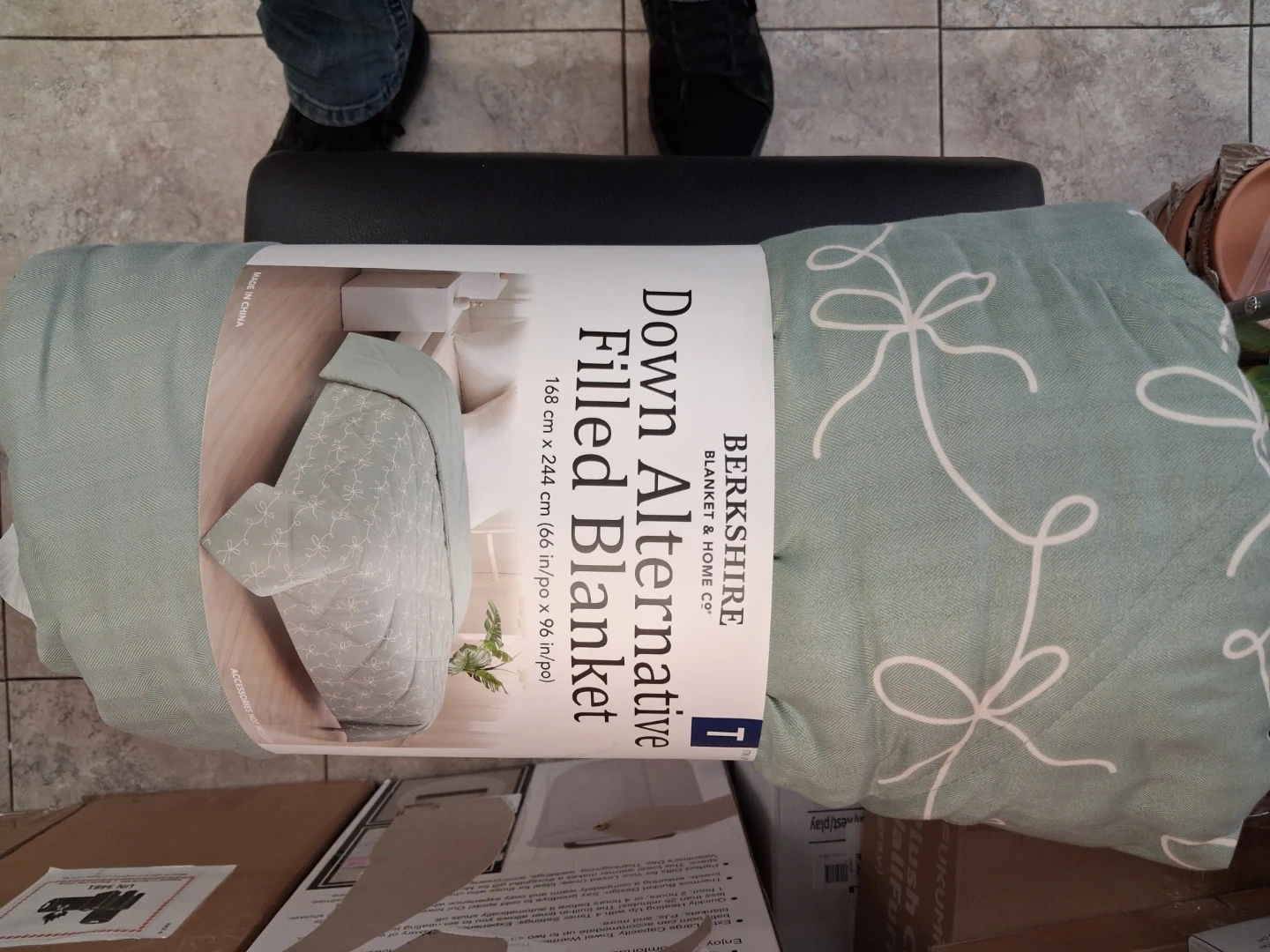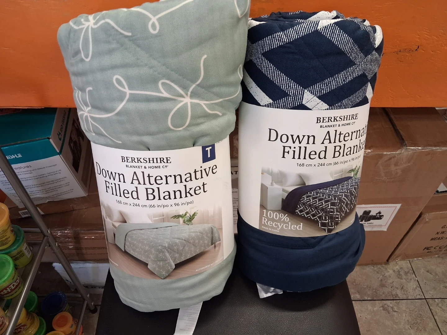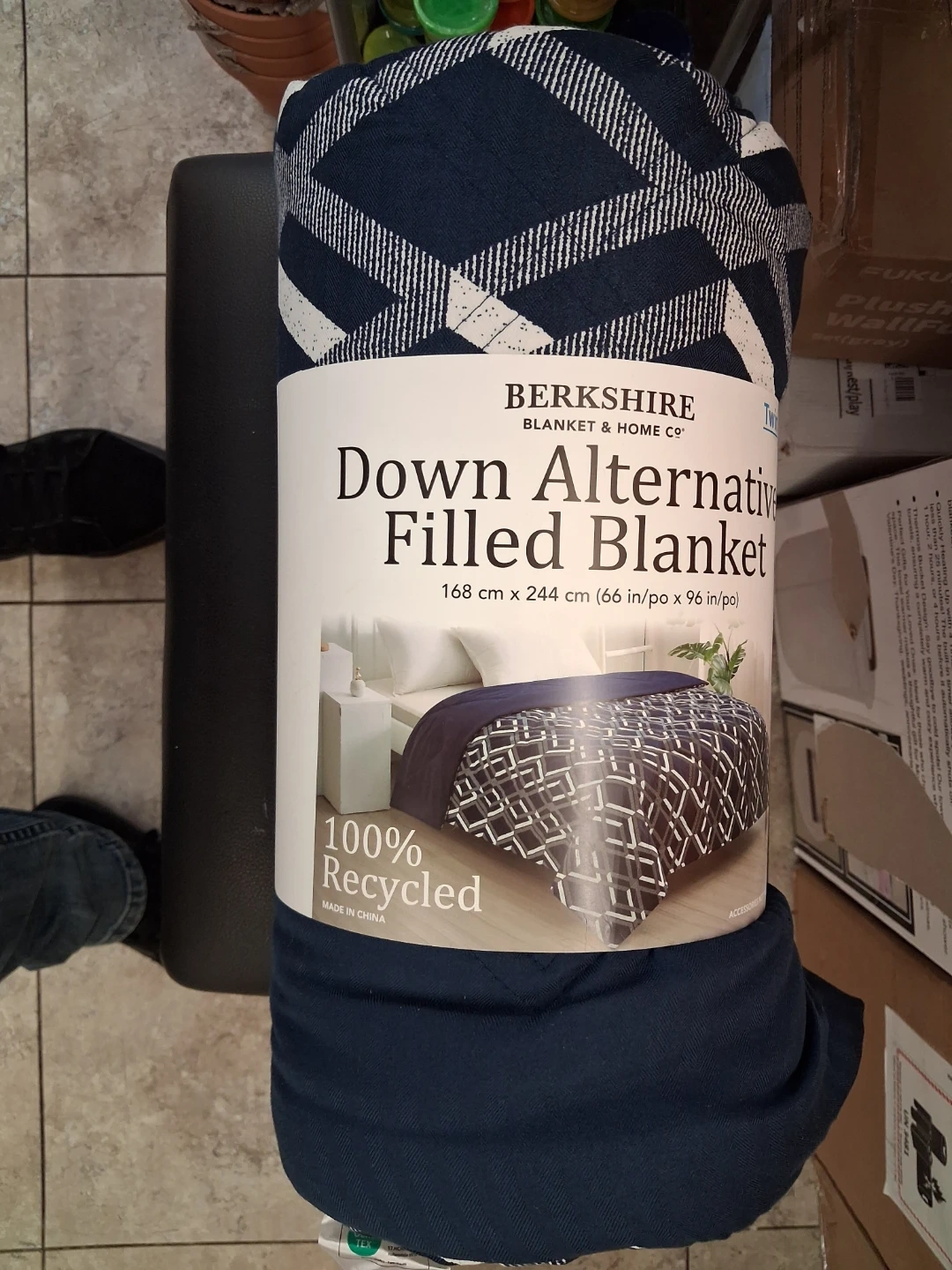 Berkshire Down Alternative Filled Blanket. Measures 168 cm x 244 cm (66 in/po x 96 in/po). Made in China.