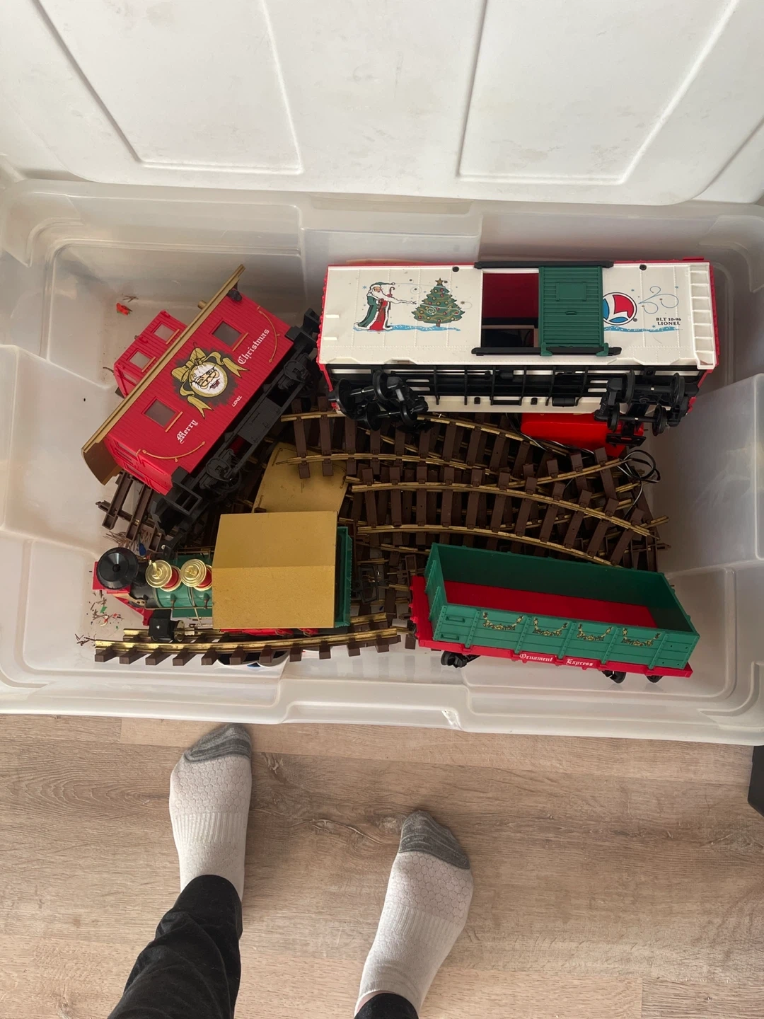 This is a Lionel Christmas train set with multiple cars and tracks. It includes a locomotive, caboose, and cargo cars, all featuring festive holiday designs. Perfect for setting up a holiday display!