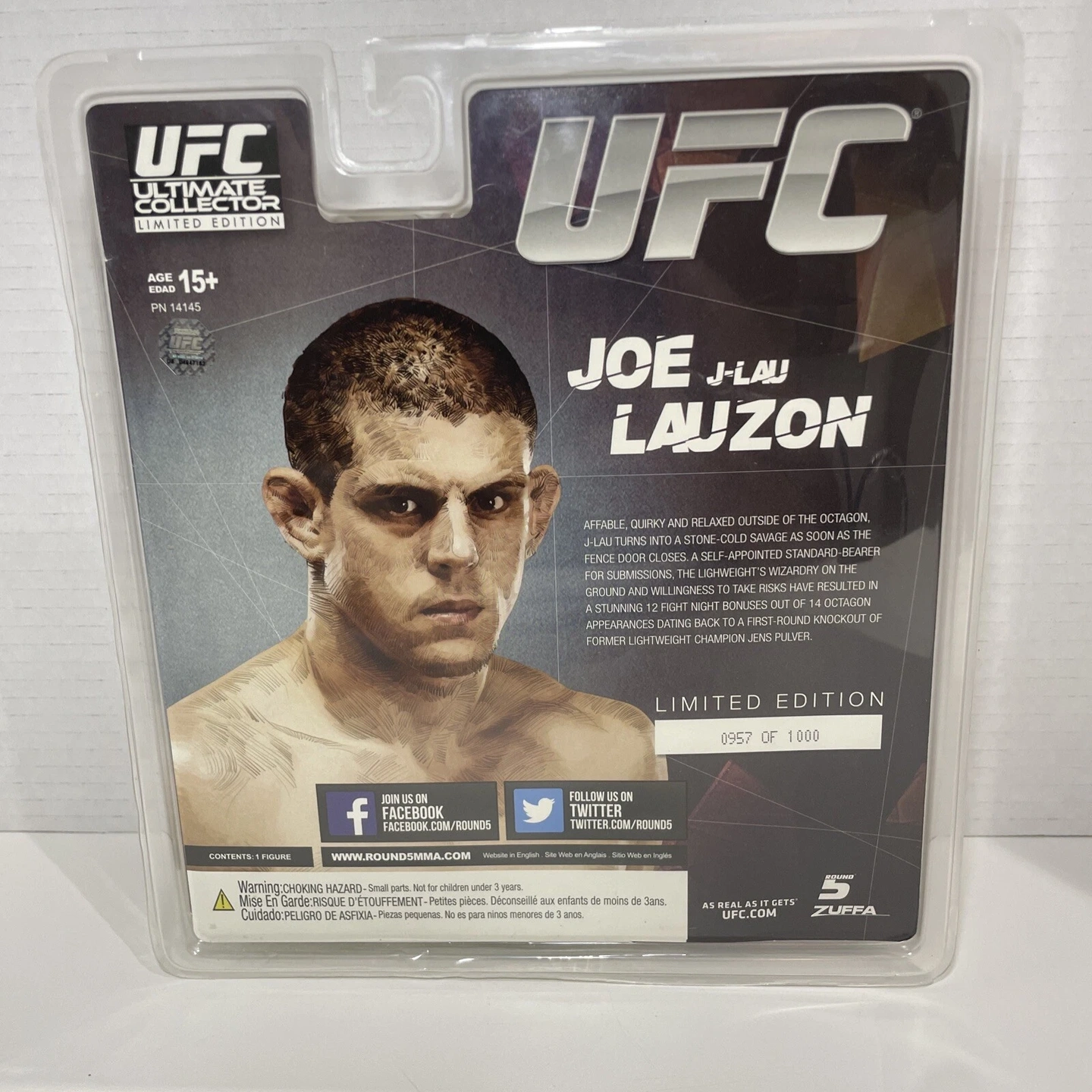 This is a Round 5 Collectors Ultimate Collector Series 2 Limited Edition action figure of Joe Lauzon. It's an original, unopened figure from Mixed Martial Arts. This is a limited edition, number 957 out of 1000.