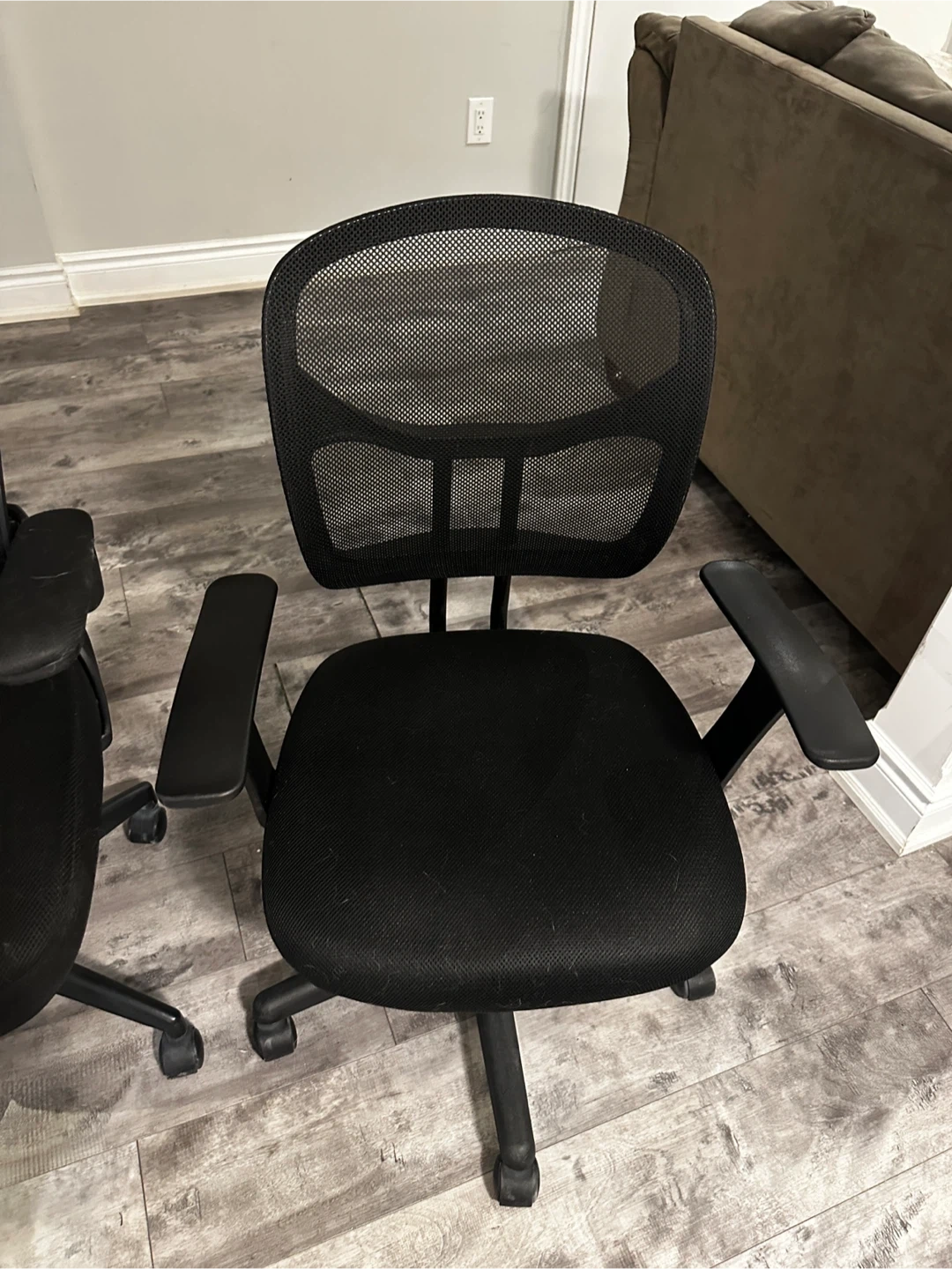 Black mesh back and fabric seat office chair. It features adjustable armrests for comfort. This chair is on wheels for easy movement around your workspace.