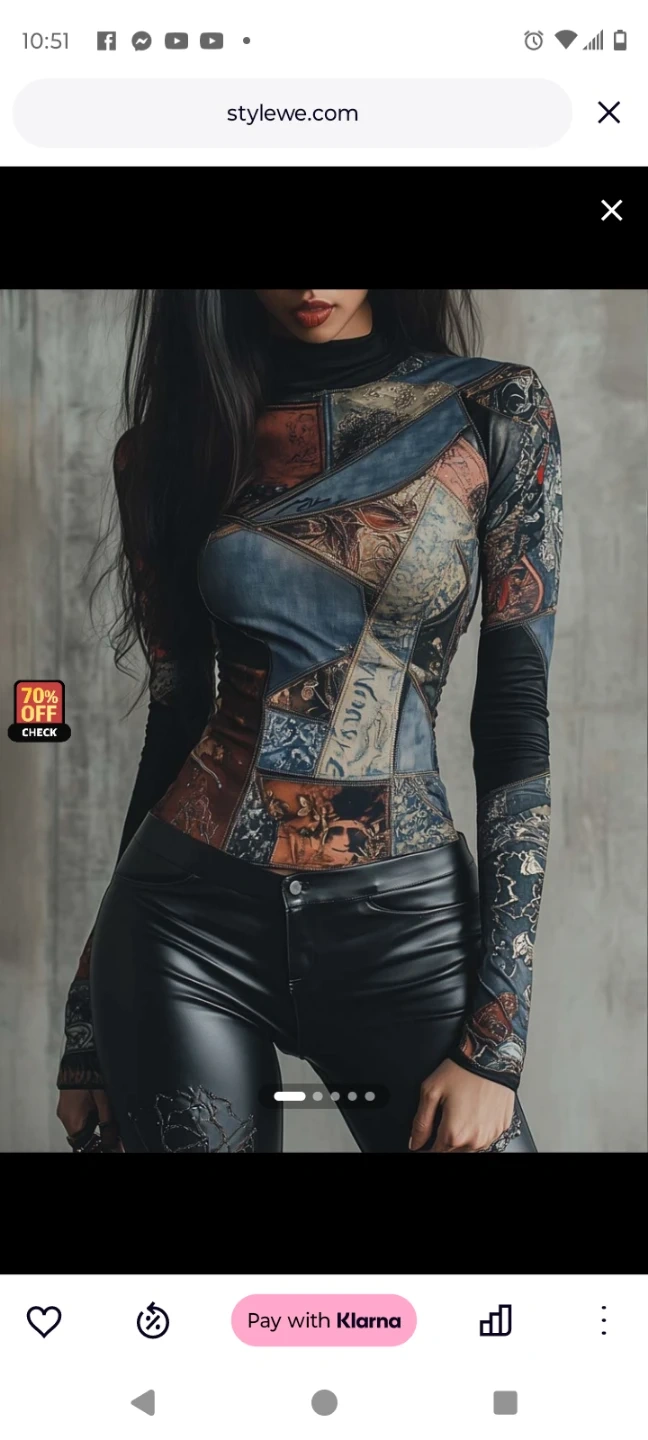 This is a StyleWe long-sleeve turtleneck top. It features a unique patchwork print with a mix of denim, vintage-inspired imagery, and script patterns. The material is stretchy and form-fitting.