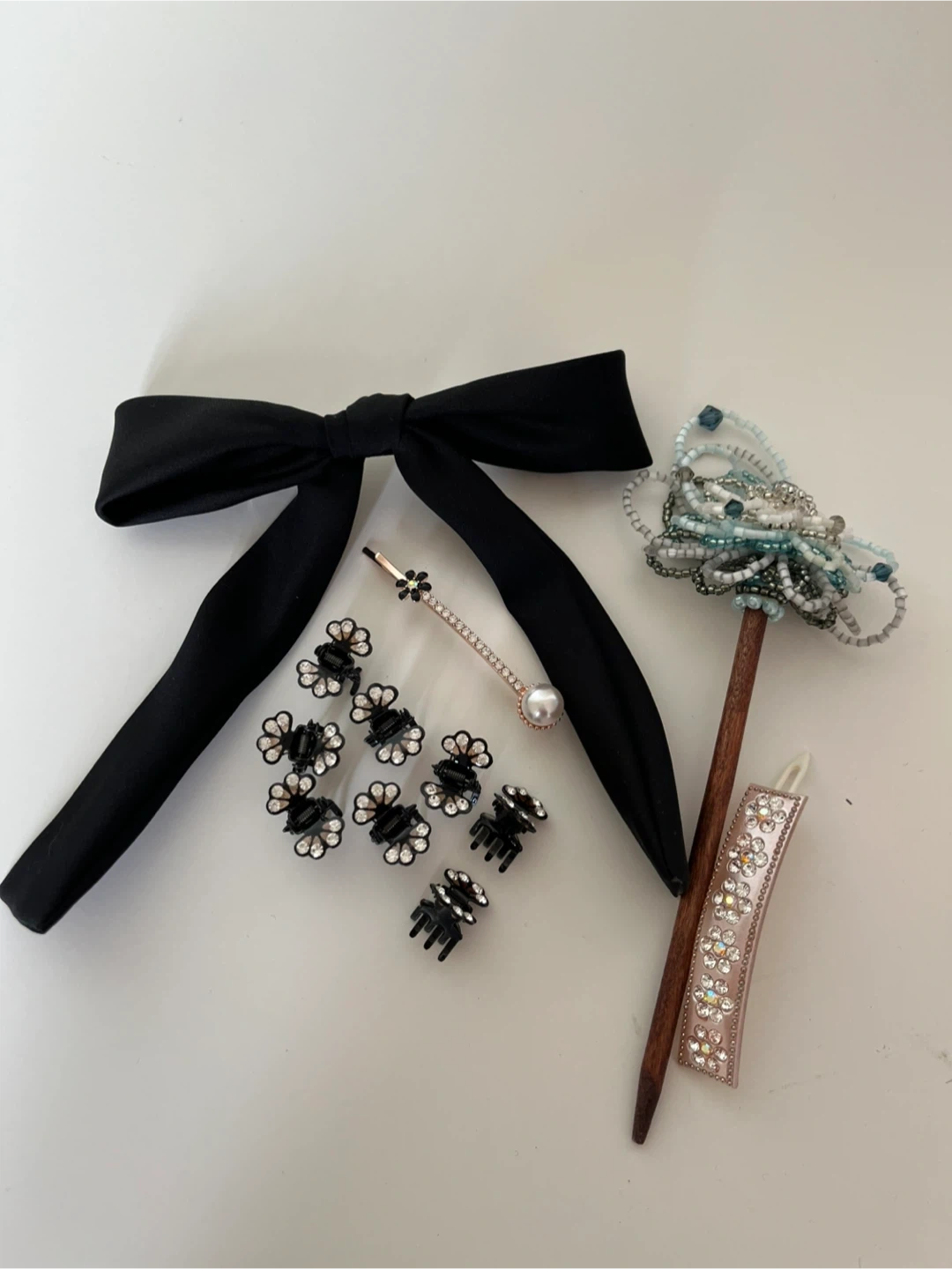 A cute collection of hair accessories! Includes a black bow, several small black flower clips, a pearl hair pin, a beaded hair stick, and a jeweled headband. Perfect for adding a little sparkle to your everyday look!