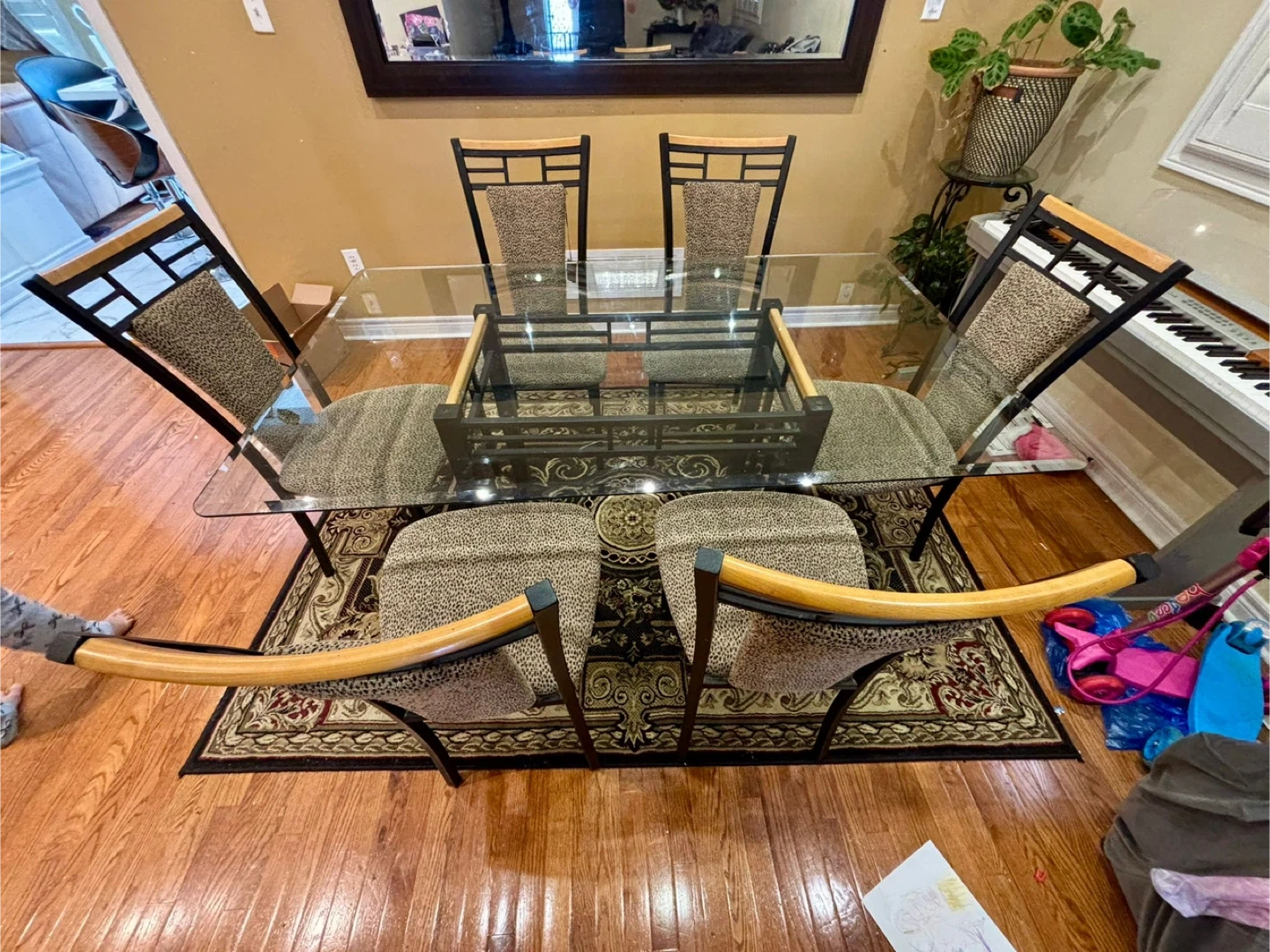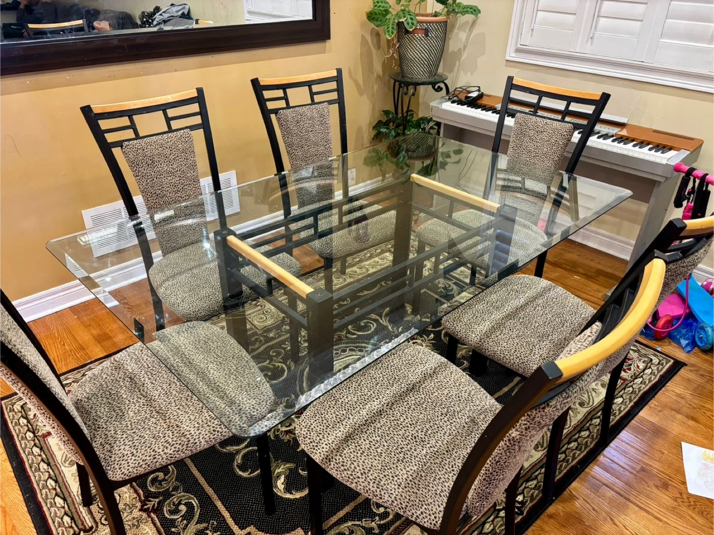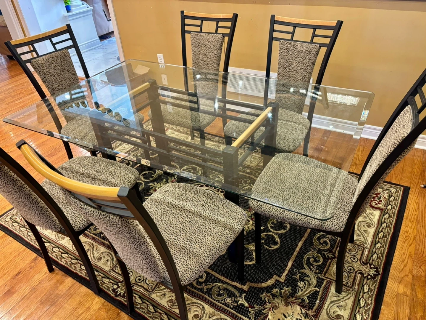 Selling dinning table with a tempered glass top and a metal frame base. The chairs are upholstered with brown and black pattern and have a metal frame. The table is in excellent condition and chairs are heavy and solid. One chair has a few cat scratches on the side, the others are in great condition and will add value to any dining room.