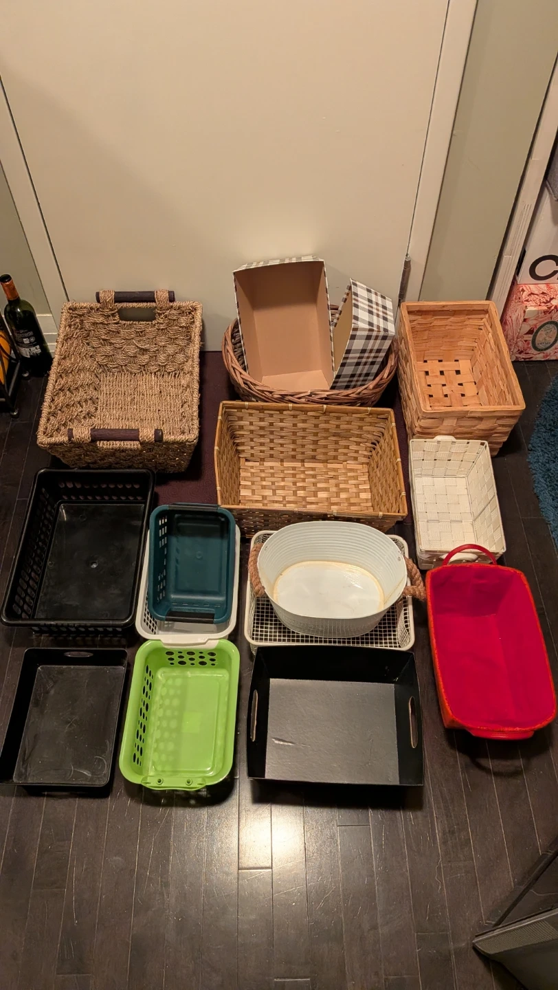 A collection of storage baskets in various materials and colours. Includes woven baskets, plastic bins, and shallow trays. Useful for organizing different items around the home.