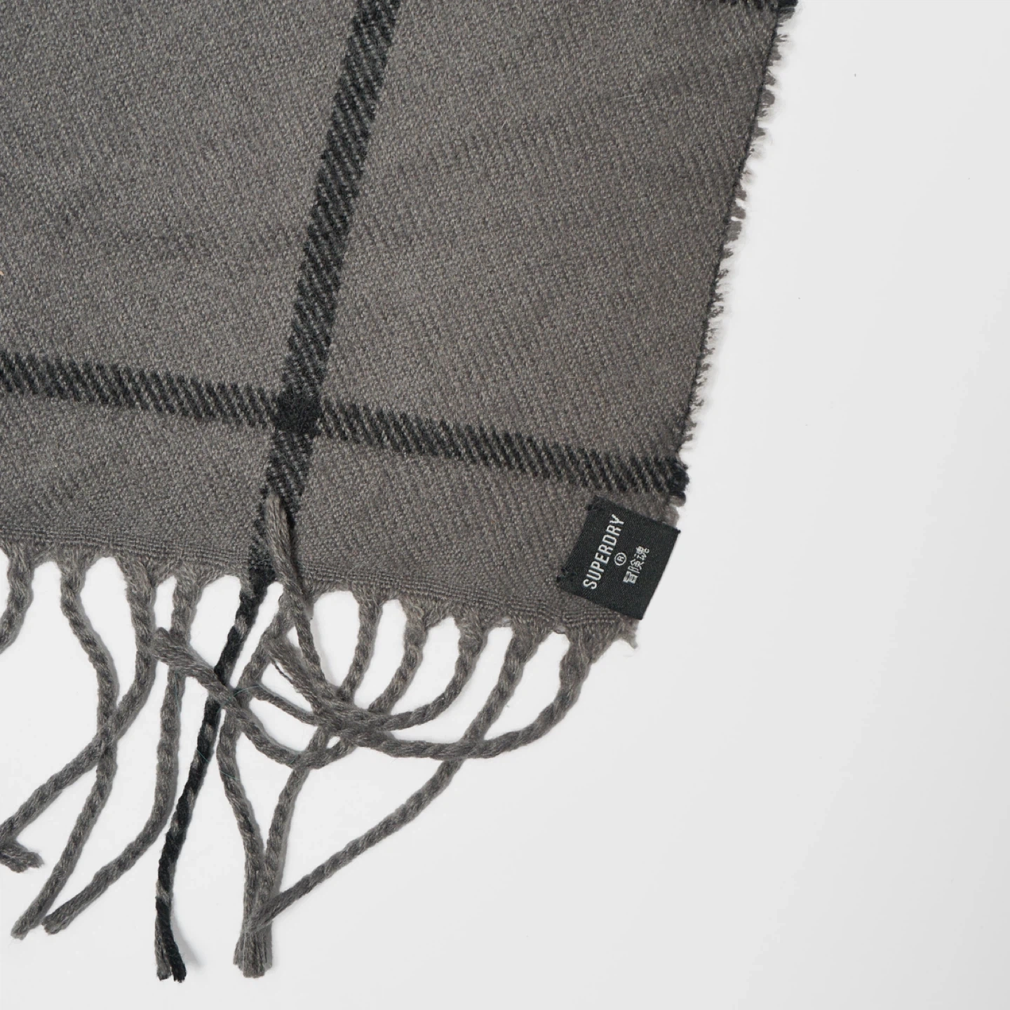 This is a Superdry plaid scarf. It features fringed edges and a classic tartan pattern. Material is an acrylic.