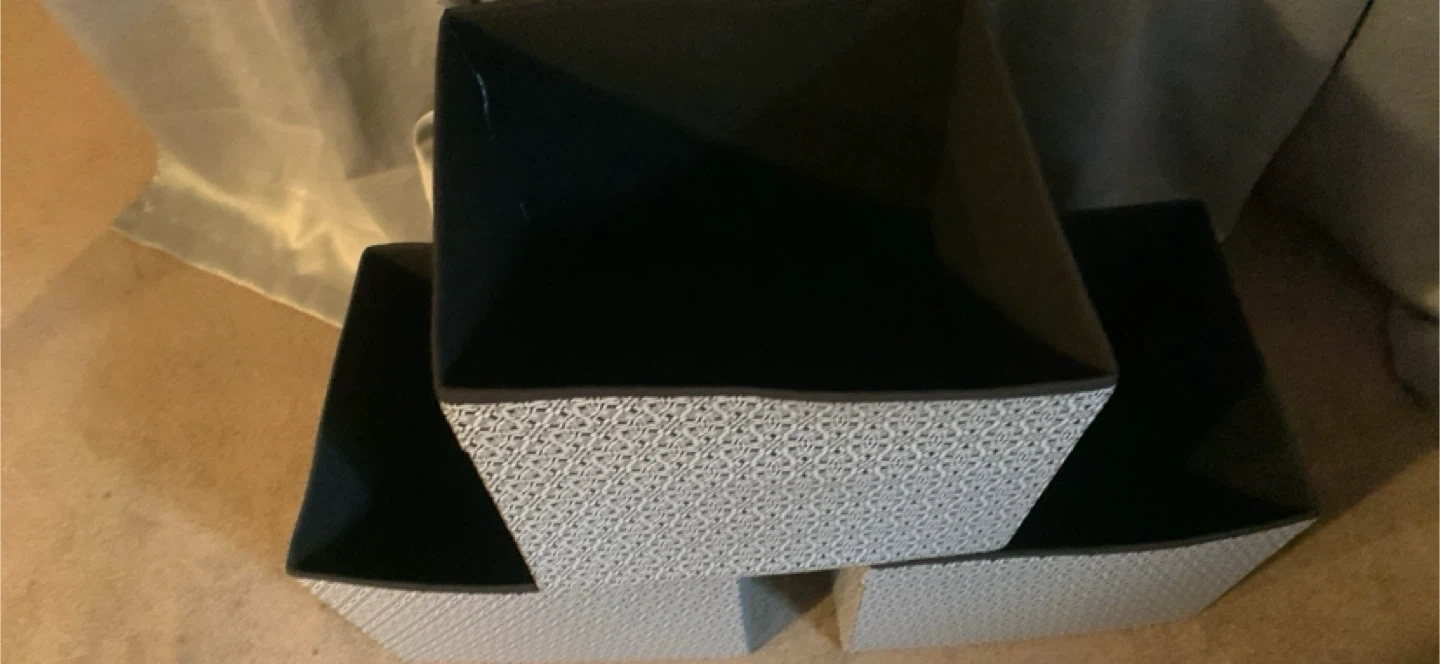 Selling a set of three storage bins. They feature a stylish geometric pattern in black and white. Perfect for organizing your space!