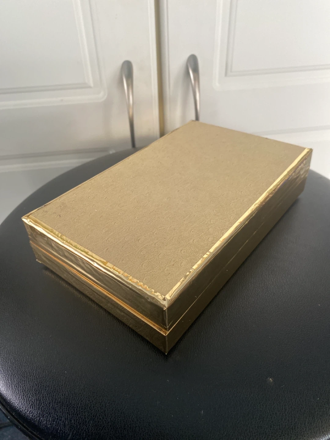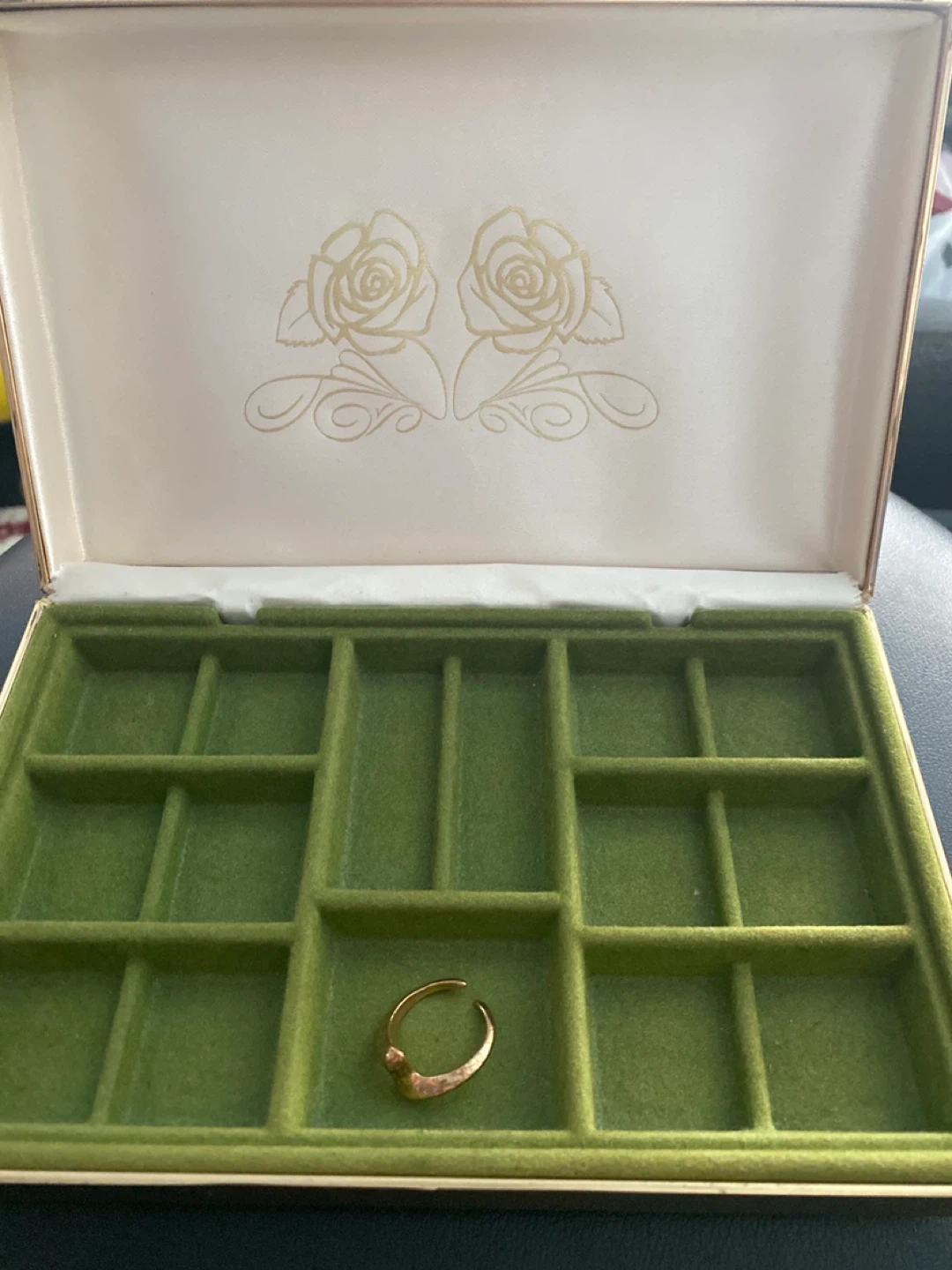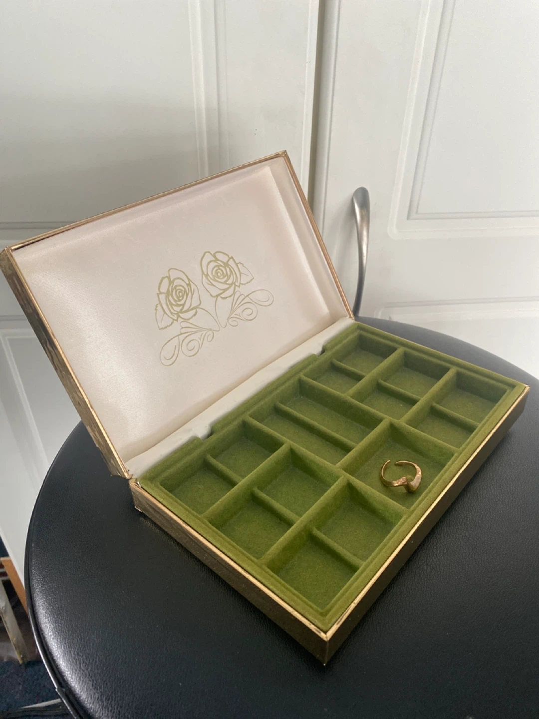 This vintage jewelry box has a gold-tone exterior and a light-coloured interior with a rose design. The inside features a green velvet lining with multiple compartments for organizing rings, earrings, and other small accessories. Comes with a free ring as shown in the picture. It's perfect for keeping your cherished pieces safe and tidy!