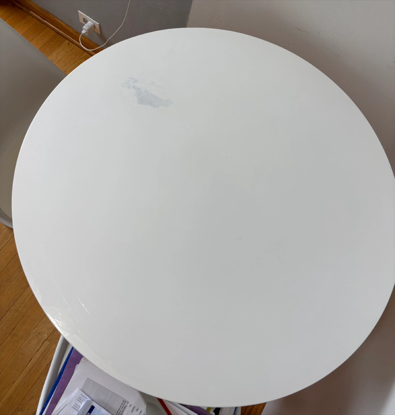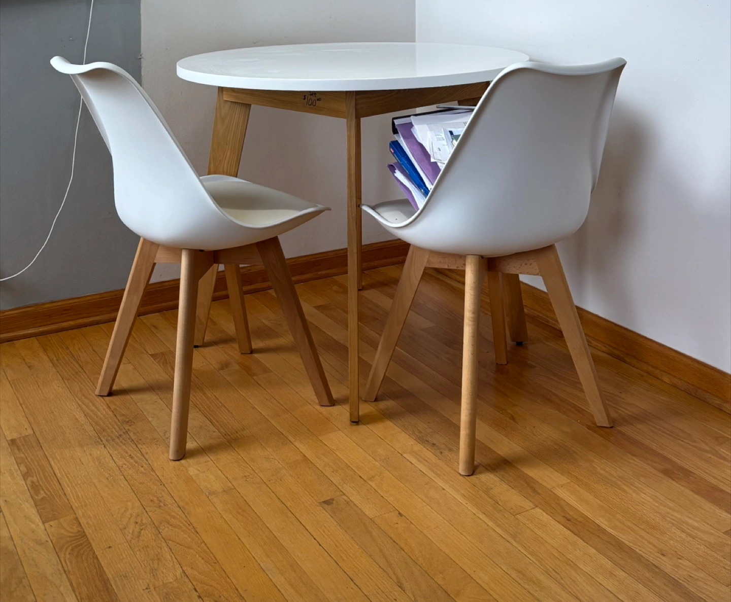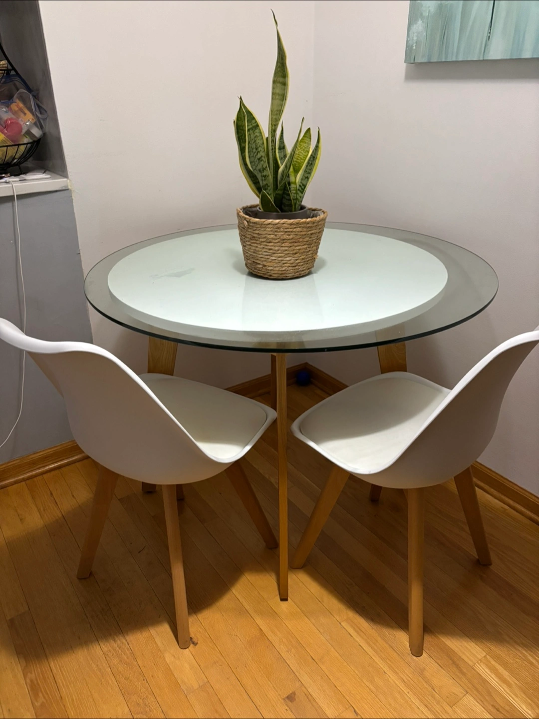 Selling a white 36” round dining table perfect for a small dining area or kitchen nook! It comes with two modern-style white chairs with wooden legs. The set is in good condition and ready to find a new home! GLASS NOT INCLUDED!