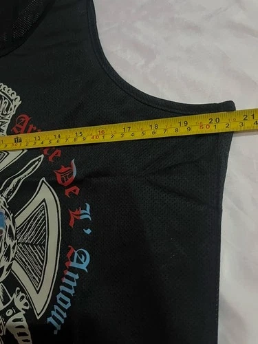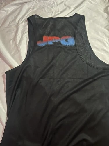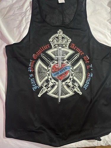 This is a stylish and classic black mesh tank top from JPGaultier, men's size L. It features a round neckline for a casual and trendy look. The graphic has a cool 90s vibe. It's a good design, but I'm unsure if it's a replica or genuine. The only tag is a small white square on the collar. I tried it on, and it has a great, flattering fit. The mesh shows skin when worn. This was found at a storage facility auction. Chest measures 41-42 inches.