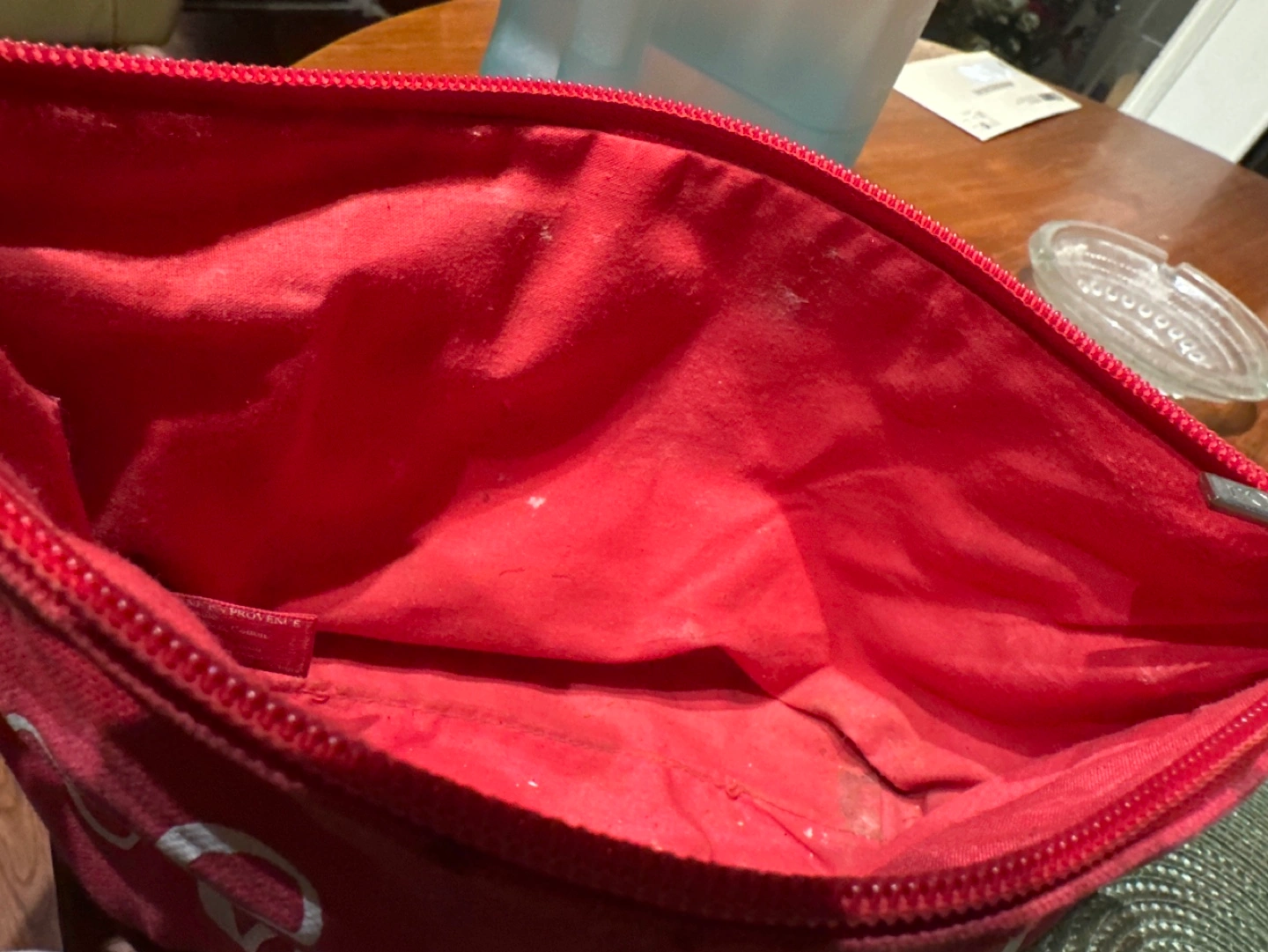 Red canvas cosmetic bag. Zipper closure. Features 'Oh la la' in white lettering. Pre-owned.