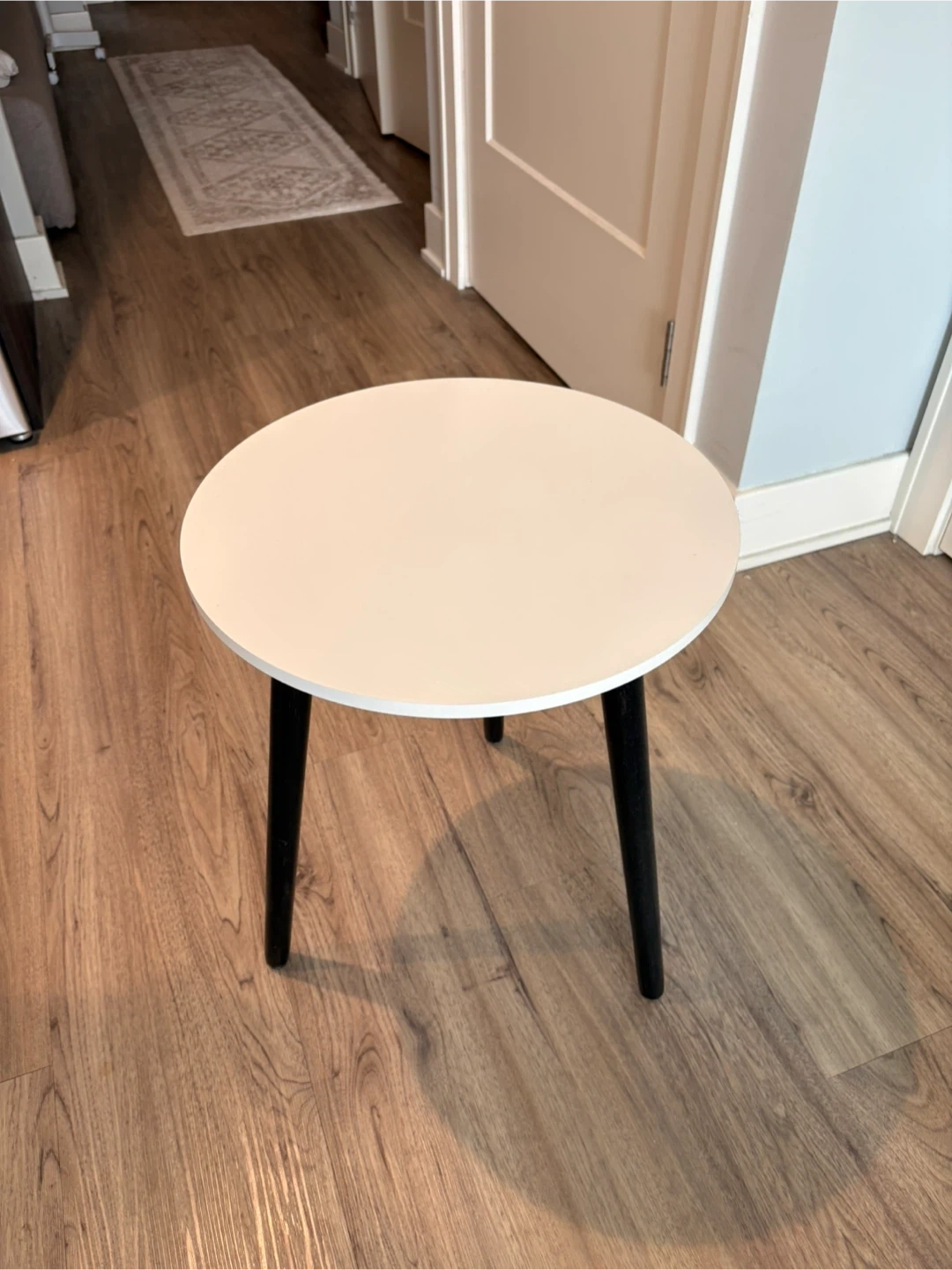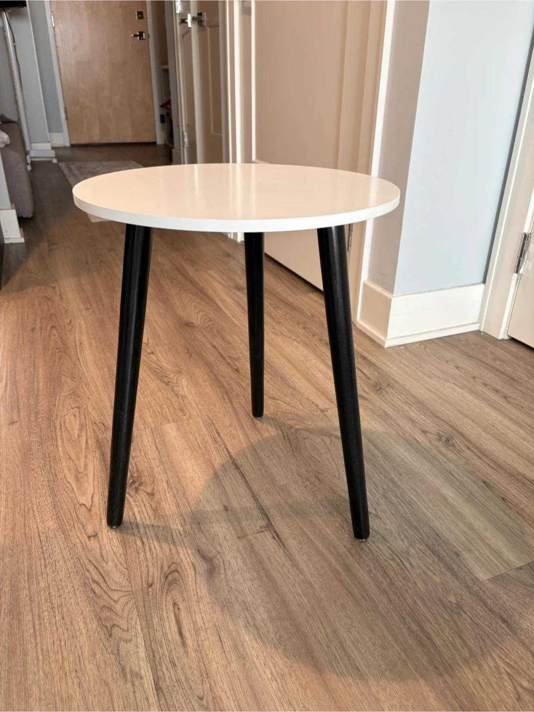 This is a simple round side table with a white top and three black tapered legs. It's a compact size, perfect for placing next to a sofa or chair. The design is modern and versatile. I have 2 of them so this price is for both. also looks great next to bed.