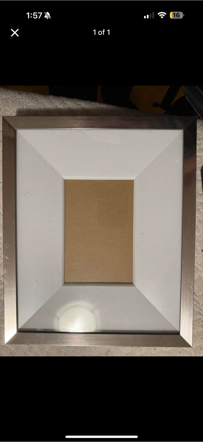 Selling a picture frame with a silver and white finish. It's in good condition and ready for your favourite photo or artwork!