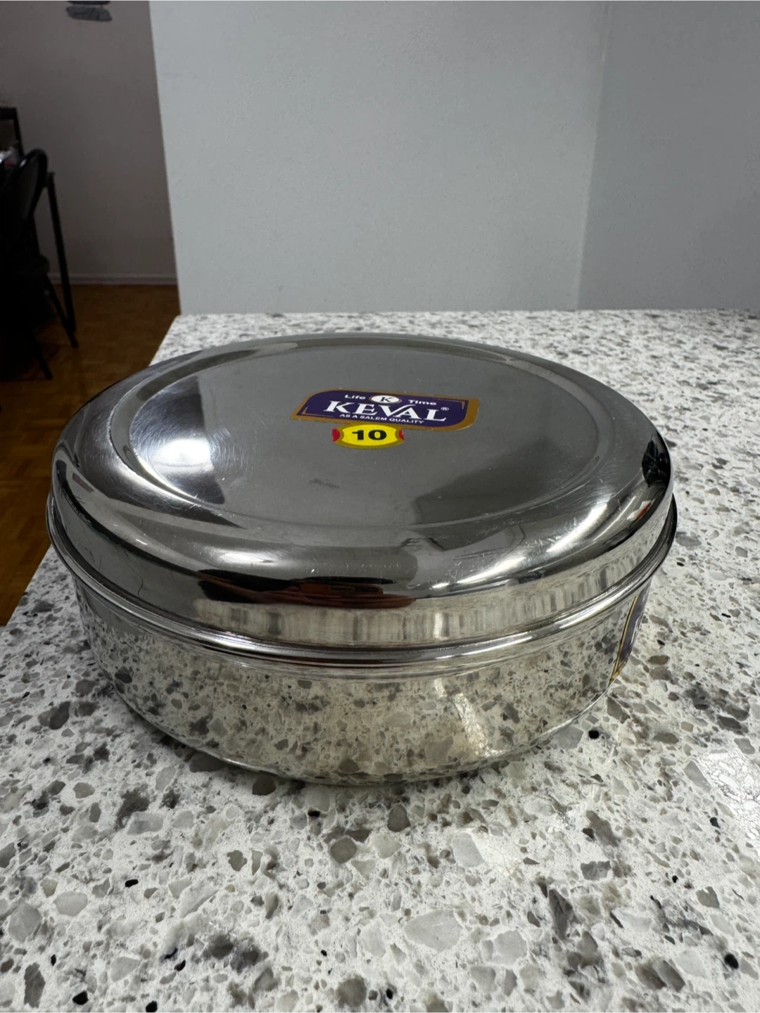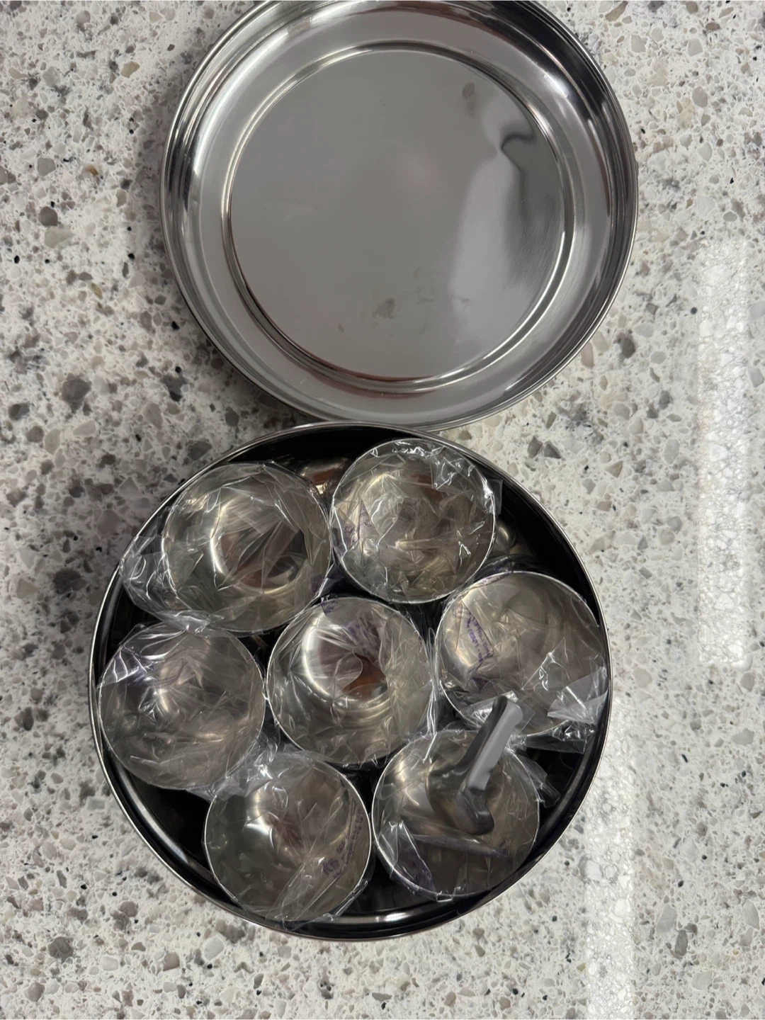 New stainless steel spice box with 7 small bowls inside. Includes a tray and lid.