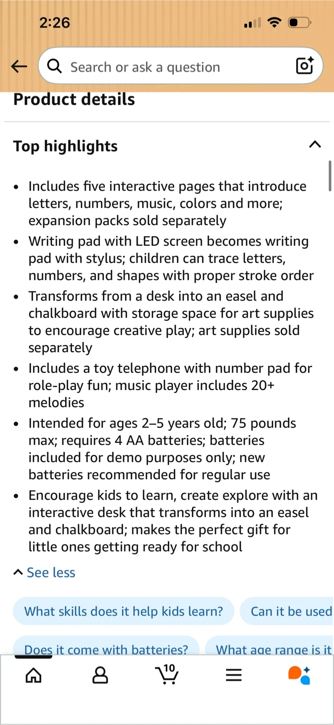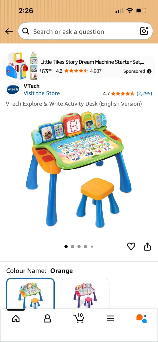 This VTech activity desk includes five interactive pages that introduce letters, numbers, and more. It transforms into an easel and chalkboard, with a toy telephone and over 20 melodies. Recommended for ages 2-5 years old.