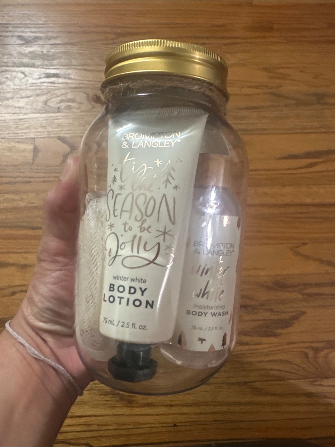 New, unopened 3-piece bath gift set. Includes body wash, lotion, and bath puff. Winter white scent. Perfect for gifting.