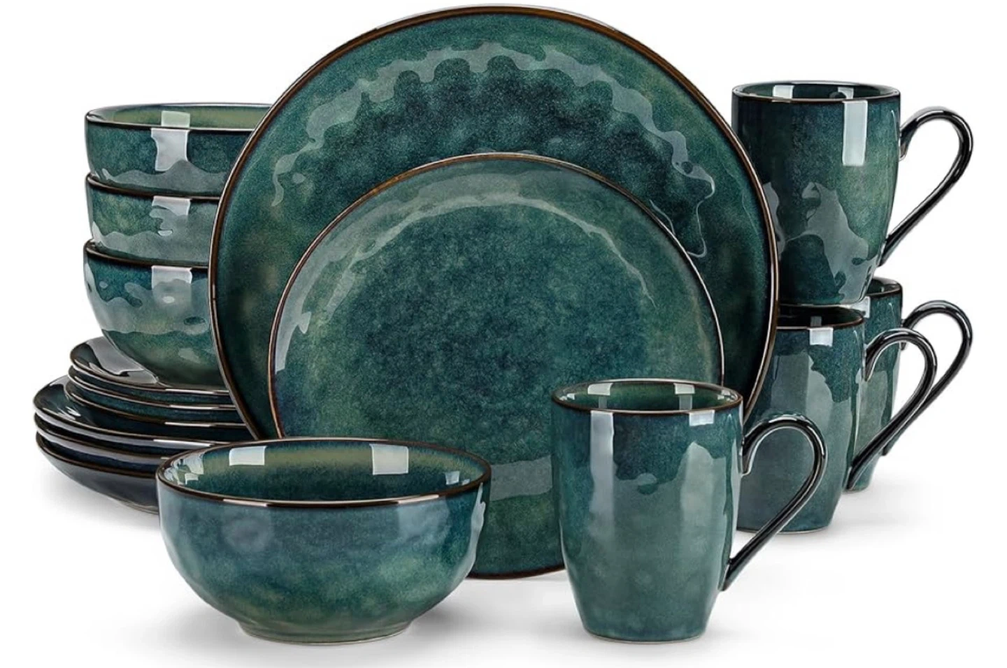 Beautiful teal-colored ceramic dinnerware set. Includes plates, bowls, and mugs. Dishwasher and microwave safe.