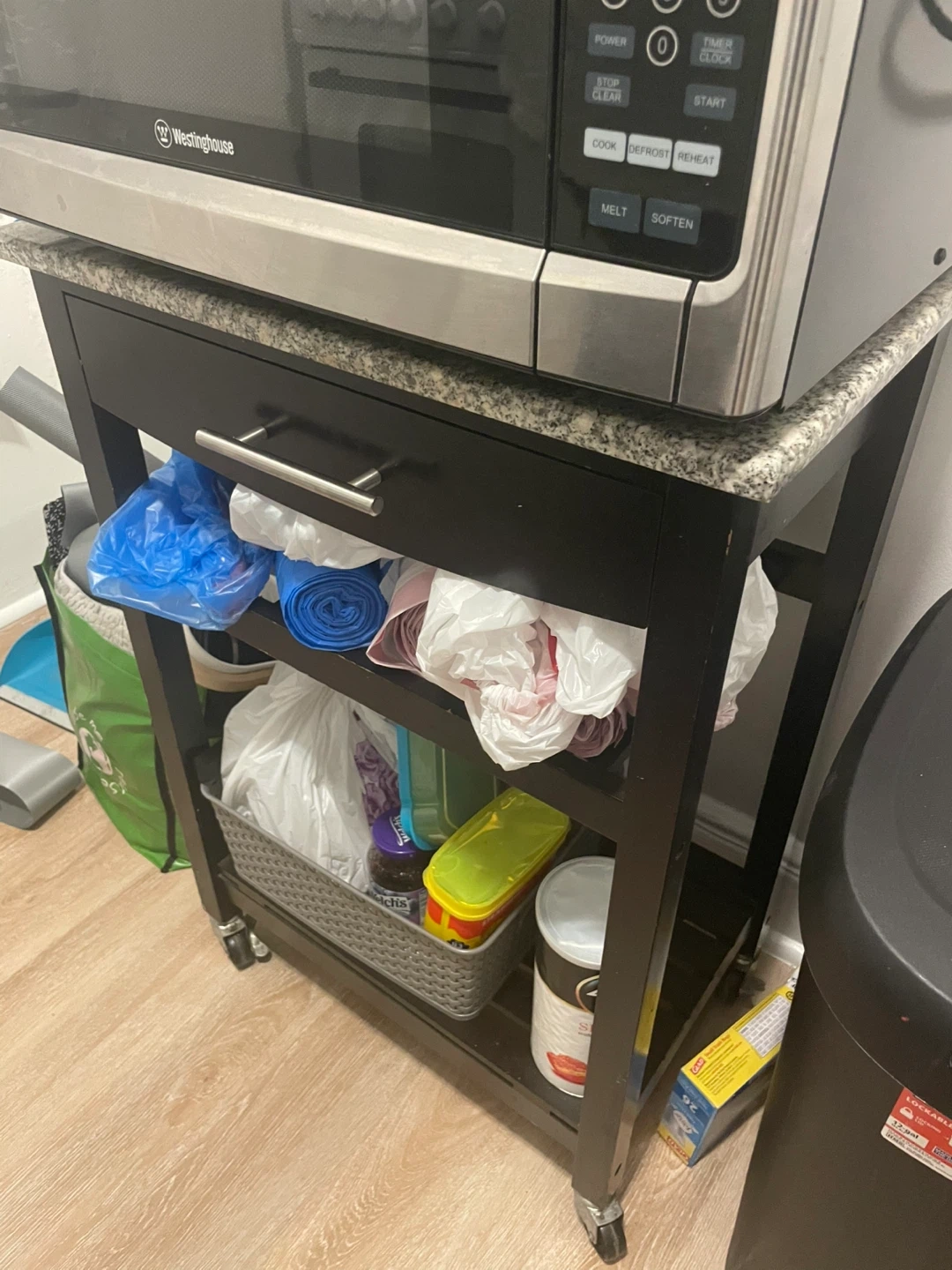 This versatile microwave cart features a convenient drawer and multiple shelves for storage. It has a durable construction and casters for easy mobility. The granite-look countertop provides a sturdy surface for appliances. It's perfect for organizing kitchen essentials!