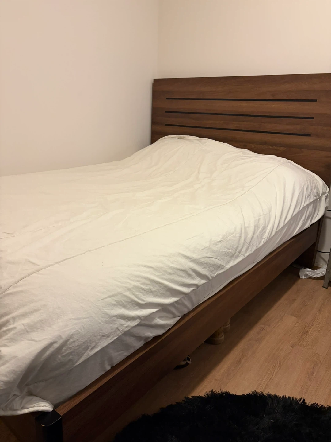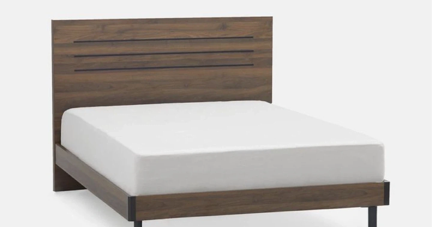 Double size bed model “Kali” in walnut finish (dark wood). Modern design with a strong and durable frame.