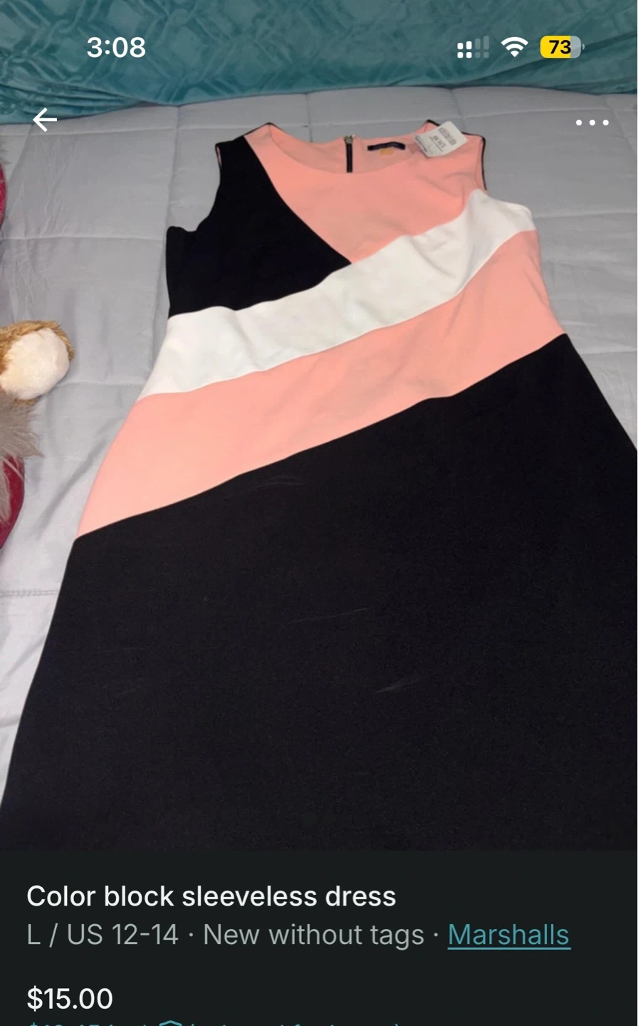 This is a sleeveless dress featuring a color block design. It's a size L or US 12-14. It's new without tags.