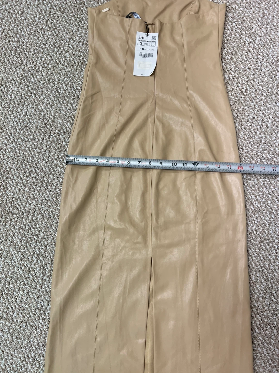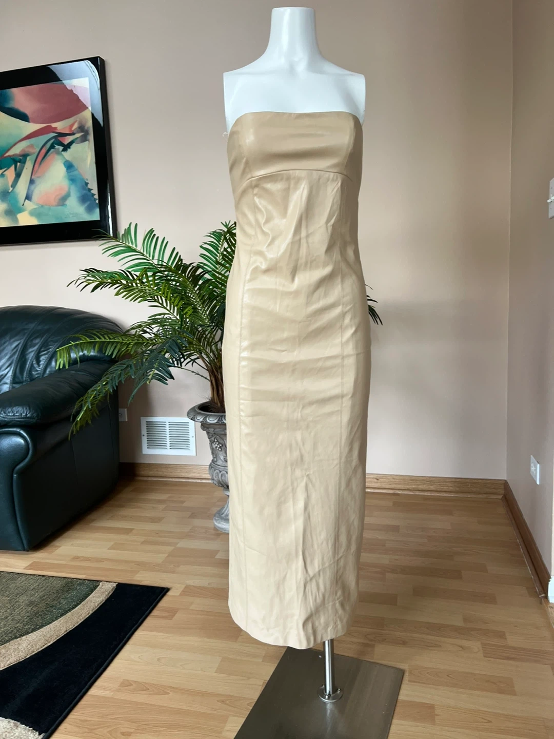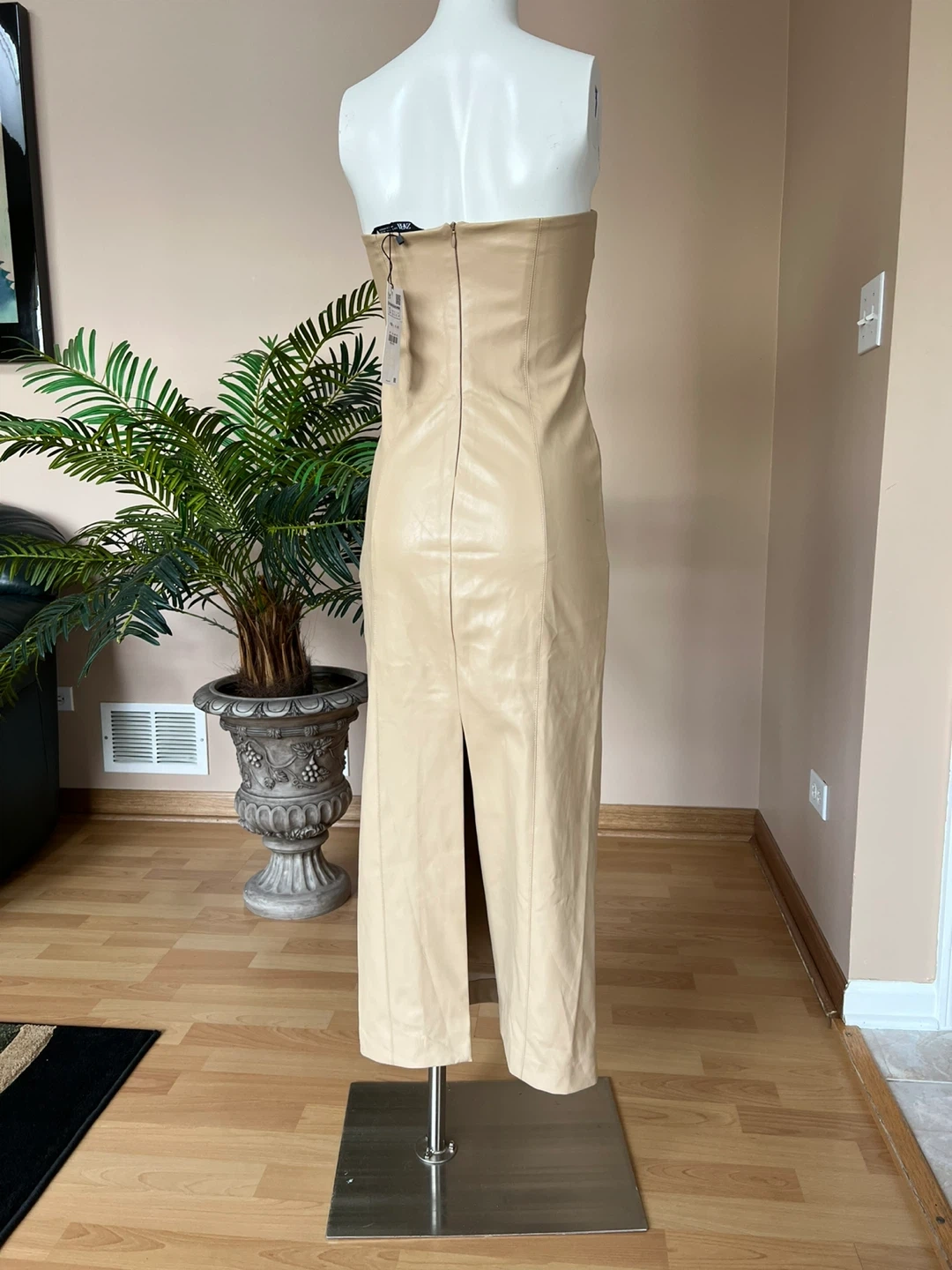 Selling a Zara faux leather strapless dress in a size small. It's a beautiful beige color, NWT, stretchable. Perfect for a night out or a special occasion! Retail price $150.
