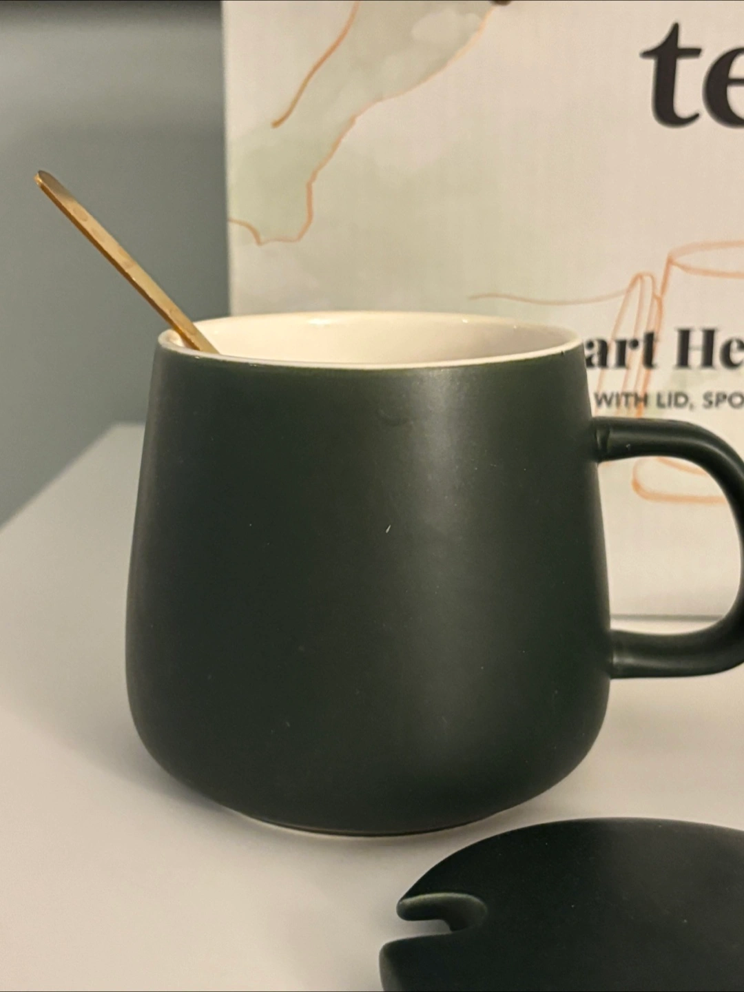 The mug is a sleek, dark green colour and looks great on any desk or table.
